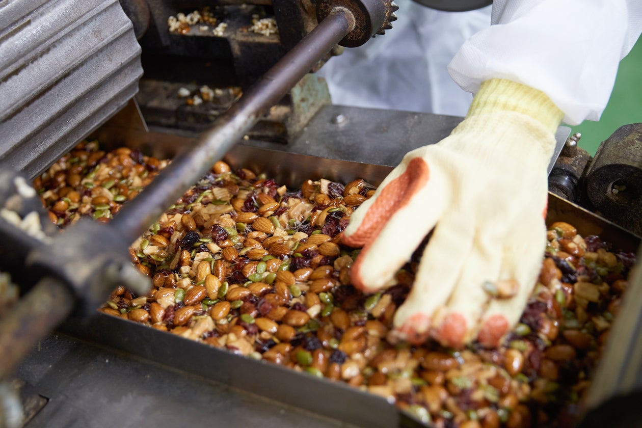 また、最初から素材全部を入れてしまうと、どの素材も水飴まみれで食感がガチガチに固くなってしまいます。最高の美味しさをつくるため、投入タイミングは1秒単位で管理しています。アーモンドバーの風味を生かす上で、もっともこだわっている作業です。