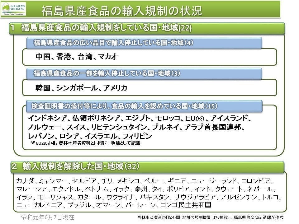 たとえば、中国や韓国へは、福島をはじめ、宮城、山形、茨城、栃木、群馬、埼玉、千葉、東京、神奈川、新潟、長野、静岡などの日本酒(水産加工品なども)が輸出できない状況です。