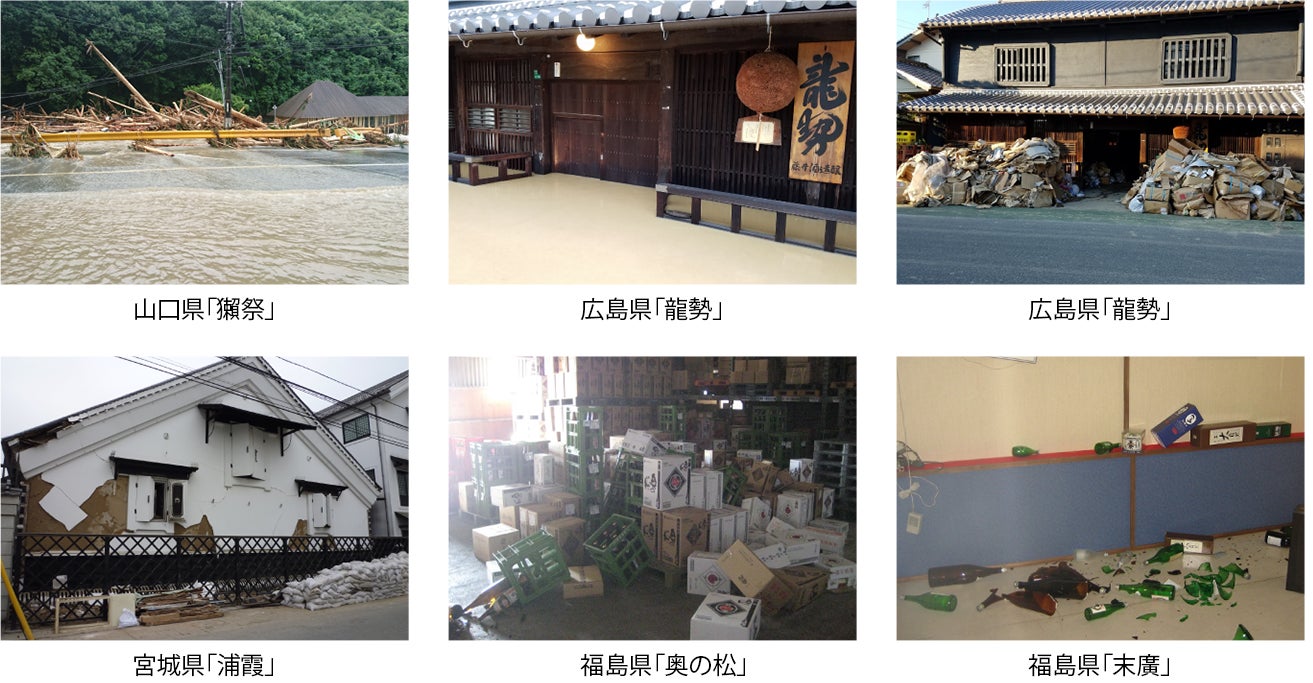 宮城県『浦霞』ブランドの佐浦、福島県会津の『末廣』末廣酒造、福島県二本松の『奥の松』奥の松酒造は、東日本大震災時の写真。先の西日本豪雨被害では、広島県竹原市で約150年間酒蔵を営む藤井酒造は酒蔵が浸水し、海外でも人気の『龍勢』4千本以上の廃棄を強いられました。山口県『獺祭』の旭酒造も、災害時前は本社蔵と直販所の間の川に橋がかかっていましたが、この時上流で土砂崩れが発生。土砂が押し寄せ、橋は跡形もないほどに破壊されました。