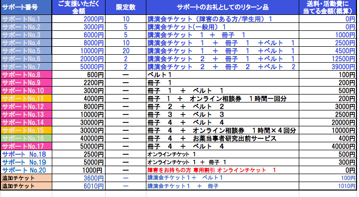 ご支援のお礼としてご用意したのは、講演会『減薬のための公開診察室』のチケット 『ゆっくり減薬の冊子』『STOP多剤処方を訴えるシリコンベルト』『オンライン相談券』、『お薬当事者研究の出前』の5つです。