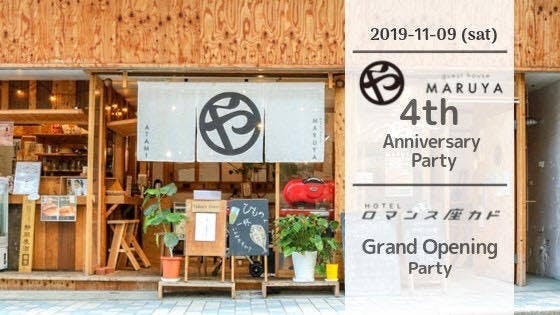 2019/11/06 19:00お知らせが遅くなってしまいましたが、今週末の土曜日に迫ってきた「guest house MARUYA 4周年&Hotel ロマンス座カドオープンイベント」についての詳細をお知らせさせていただきます。下記に【概要】と【スケジュール】を載せていますが、詳しい内容については Facebook のイベントページ に投稿していますので、こちらをフォローしていただけると嬉しいです。----- イベント概要 -----【日時】2019年11月9日(土) 11:00~21:00【場所】(リンクをクリックすると GoogleMap に飛びます)・RoCA[メイン会場]・guest house MARUYA・Hotel ロマンス座カド【参加費】無料(フード、ドリンク、各イベントはキャッシュオン制)【詳細】Facebookイベントページhttps://www.facebook.com/events/324407315000890/----- スケジュール【メイン会場】 -----14:00〜 オープニング・トーク @RoCA奥ー 株式会社machimori 代表 市来広一郎 挨拶、乾杯(5分)ー 宮崎晃吉さんトーク(30分)ー machimori 市来・三好トーク(15分)guest house MARUYA のこれまでとmachimori不動産の誕生、そしてロマンス座カドー 休憩、準備(10分)【詳細】https://www.facebook.com/events/528827807664911/15:00〜 トークセッション第一部 @RoCA奥ー 銀座町の今昔そしてこれから(40分)小倉一朗、二見一輝瑠、小澤毅、豊田ちほー 休憩、準備(20分)【詳細】https://www.facebook.com/events/555872215178738/16:00〜 マルヤ4周年記念 映画のススメ拡大版 @RoCA奥ー 挨拶、「熱海の路地の子」上映(15分)ー トーク(30分)佐々木誠、永田雅之、HALa 9000、豊田ちほー 休憩、準備(15分)【詳細】https://www.facebook.com/events/2479331265631031/17:00〜 トークセッション第二部(ロマンス座カド誕生秘話) @RoCA奥ーリノベーションの裏側(30分)市来広一郎、宮崎晃吉、田坂創一、太田大翔、戸井田雄ー 休憩、準備(10分)ー ロマンス座カド誕生の物語(40分)市来広一郎、豊田ちほ、渡辺沙絵子、岡田良寛ー ロマンス座カドとmachimori が目指すこれから(10分) 市来広一郎、豊田ちほ【詳細】https://www.facebook.com/events/555872215178738/18:30〜 DJ/VJイベント @RoCA奥HALa 9000、ロンサムDJの方々でBGMを演出・夕食&ゆったり交流タイム @RoCA奥飲食:風のね、QUARTO、La DOPPIETTA、小俣さん屋台(MARUYA Terraceのドリンクも持ち込み可)20:00〜 エンディング @RoCA奥ー ちゃ~べん&鎌田純子 ライブ(30分)ー 市来 挨拶ー 記念撮影【詳細】https://www.facebook.com/events/1441919435960357/----- スケジュール【その他会場】 -----11:00〜 ロンサム / LONESOME ポップアップショップ @ロマンス座カド屋上15:00〜 熱海写真さんぽ(参加費:500円) @まちなかhttps://www.facebook.com/events/531914164290179/18:30〜 / 19:15〜 熱海銀座劇場ス○リップツアー(参加費:3,000円) @熱海銀座劇場https://www.facebook.com/events/1855538644592626/11:00~16:30 Hotel ロマンス座カド内覧12:00~16:30 guest house MARUYA 内覧12:00~19:30 guest house MARUYA ラウンジ解放----- ドリンク・フード -----10:00〜QUARTOLa DOPPIETTA12:00〜MARUYA TerraceVage Brake(弁当)パン樹 久遠(パン各種)17:00〜 @コミュニティスペースひまわり前小俣商店(串揚げ)18:30〜 @RoCA奥風のね(おむすび、野菜スティックサラダ、地魚のスパイシーグリル)----- 宿泊について -----イベント当日限定で、guest house MARUYAは【1泊3,900円から】宿泊可能です。(しかも、大人気の朝ごはん付き!)下記の予約サイトにて空き状況をご確認ください![じゃらん]https://00m.in/j8J4W[楽天トラベル]https://is.gd/DIoQNQ※チェックインは13:00~20:30、入室可能となるのは17:00からです。荷物のお預かりはできますのでお声がけください。Hotel ロマンス座カドも 11月9日(土) の宿泊より予約が開始されています。ご予約の際は、こちらのフォームに入力していただき、弊社より折り返し連絡を差し上げて初めて予約確定となります。(返信は1営業日以内にいたします。それまでは仮予約の状態です)ご期待に添えない場合もございますので予めご了承ください。(万が一返信がない場合は、恐れ入りますが再度ご連絡ください)[予約フォーム]https://forms.gle/Ye6y7Gmi5fz5uz5J8[連絡先]maruya@atamista.com0557-82-0389(受付 8:00 ~ 21:00)※ 電話でのご予約も可能です。guest house MARUYAと共通の予約窓口になっておりますので、電話での予約の際は「ロマンス座カドの予約」とお伝えください。※ 宿泊日まで3日以内の場合はフォームに入力の上、お電話でご予約ください。会場で皆さまにお会いできることを楽しみにしています! もっと見る