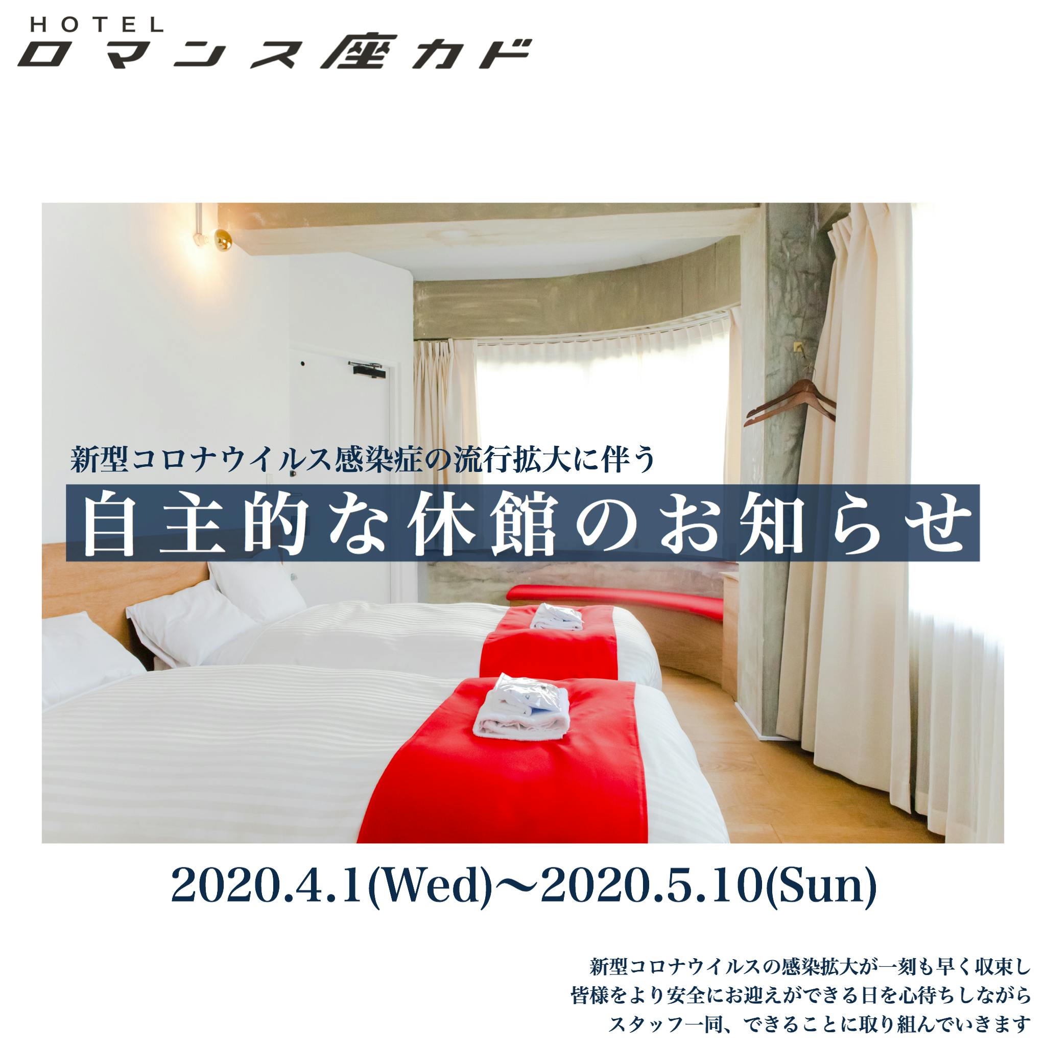 2020/04/01 17:00みなさま、ご無沙汰しております。株式会社machimoriの市来広一郎です。突然のご連絡ではございますが、昨今の新型コロナウイルス感染症の流行拡大を重く受け止め、「ロマンス座カド」を含む弊社宿泊施設において自主的な休館の決断をしました。ご存知の通り、熱海は関東圏からの観光客の方が多く、高齢化率も非常に高いという地域特性があります。そのような状況のなか、ゲストの方々に対してスタッフや街の方々との交流を心の底から促せない形での営業を続けていくべきなのか、慎重に議論を重ねてきました。そして、近隣都県で不要不急の外出自粛が要請されていること、会社として現場で働く社員や街の方々を守ること、ゲストの方々へ十分なサービスの提供が難しいことなどを考慮して、・4月1日(水)から5月10日(日)までの完全休館(新規予約の受付停止)という方針を決めました。(その他の運営施設の営業についてはこちら)観光業が主軸の熱海において、旅館・ホテル業の方々及び商店街の方々にもご迷惑をおかけするという懸念もあるなか、休館の判断は苦渋の決断ですが、何卒ご理解いただけますと幸いです。新型コロナウイルス感染症が一刻も早く収束し、皆様をより安全にお迎えができる日を心待ちしながら、休館中もできることに取り組んでいきます。引き続きお力添えのほど何卒よろしくお願い申し上げます。株式会社machimori代表取締役 市来広一郎 もっと見る
