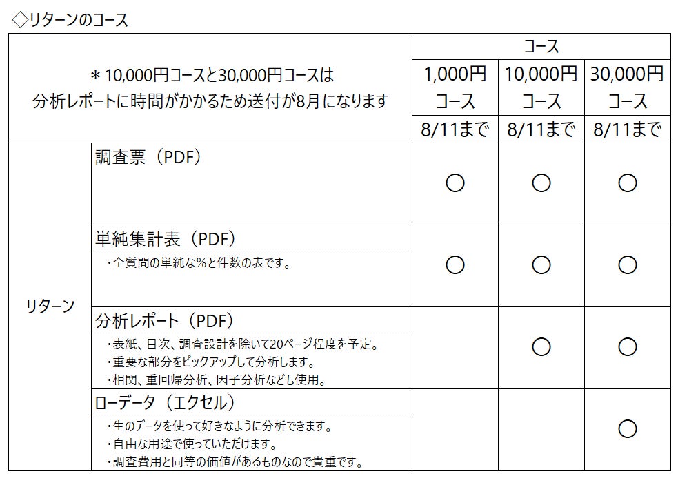 今回クラウドファンディングではインターネット調査を実施するための費用のため、みなさまに資金をお願いしたいと思います。インターネット調査とは、あらかじめ調査会社の登録をしたパネルの登録者に対してインターネット上の回答フォームに答えてもらうというものです。調査会社の見積もりが10万円でしたので、個人的に実施することが難しいと判断したため、クラウドファンディングを利用することといたしました。(クラウドファンディング会社に17%差し引かれる分を足しているので目標金額は12万円です。 )