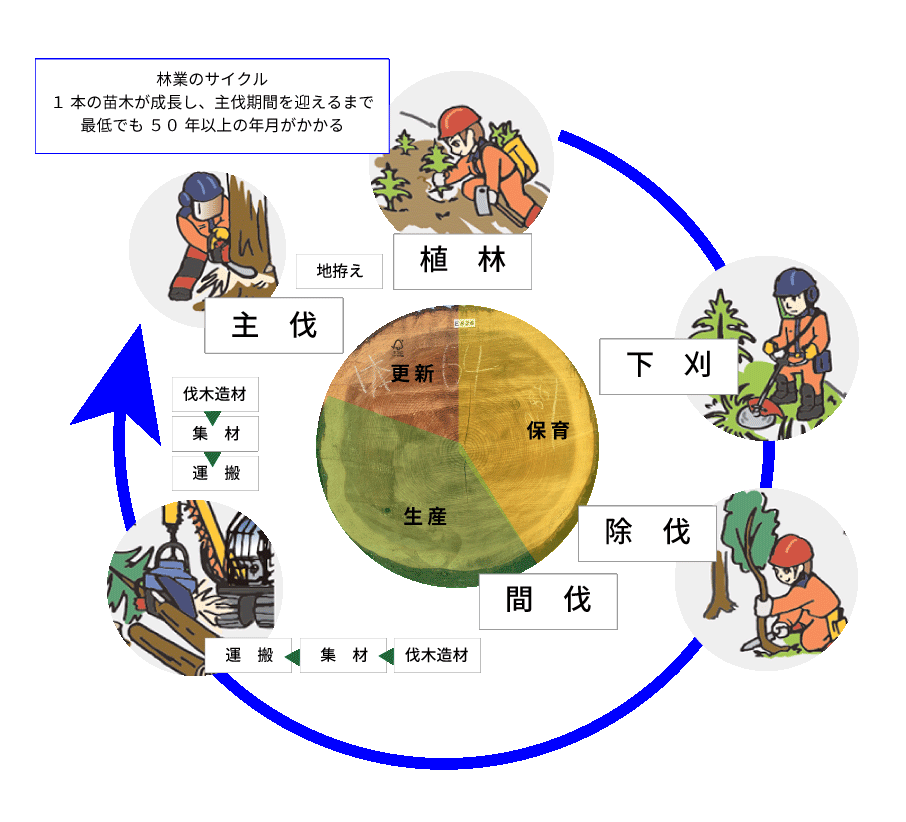 林業の仕事は、山に木の子どもである「苗木」を植え、その木を50~60年という期間、除伐(※1)や間伐(※2)を行い、大切に世話をしながら育てます。