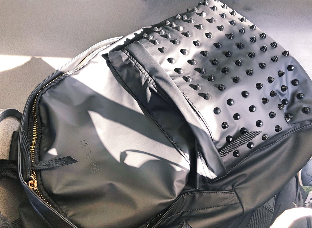 一見どこにでもあるデイパックに見えがちですが、スタッズがついていることで、スパイスの効いた少しインパクトのある見た目に。更に金色のファスナーを使用することにより、ベーシックなリュックより高級感あるようにデザインしました。