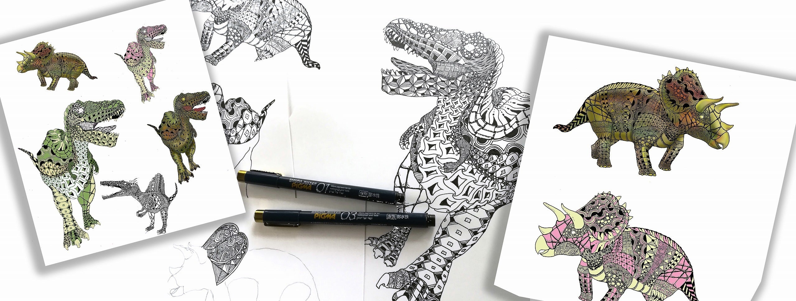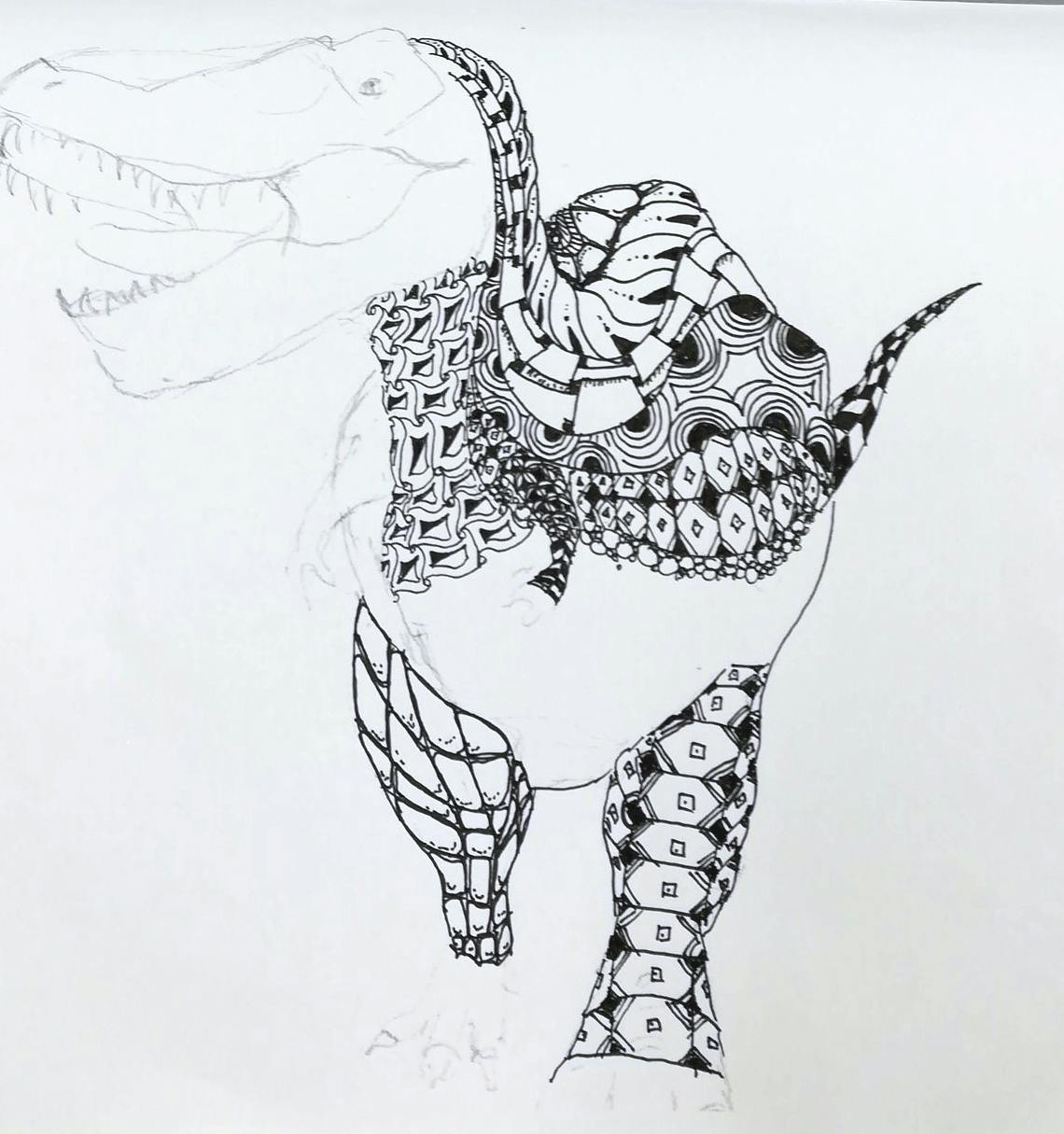 もともと二人で描いていた恐竜のイラストを、パトロンの皆さまに気に入っていただけるように二人でブラッシュアップしました。「その線はちょっと違うからこっちにしてよ」「ティラノサウルスの足は一番強いところだから、固い皮膚が分かる模様にして」とコタモ監修ののもとイラストを二人で描きました。皆様に喜ばれるよう、クオリティの高いイラストを目指しました。