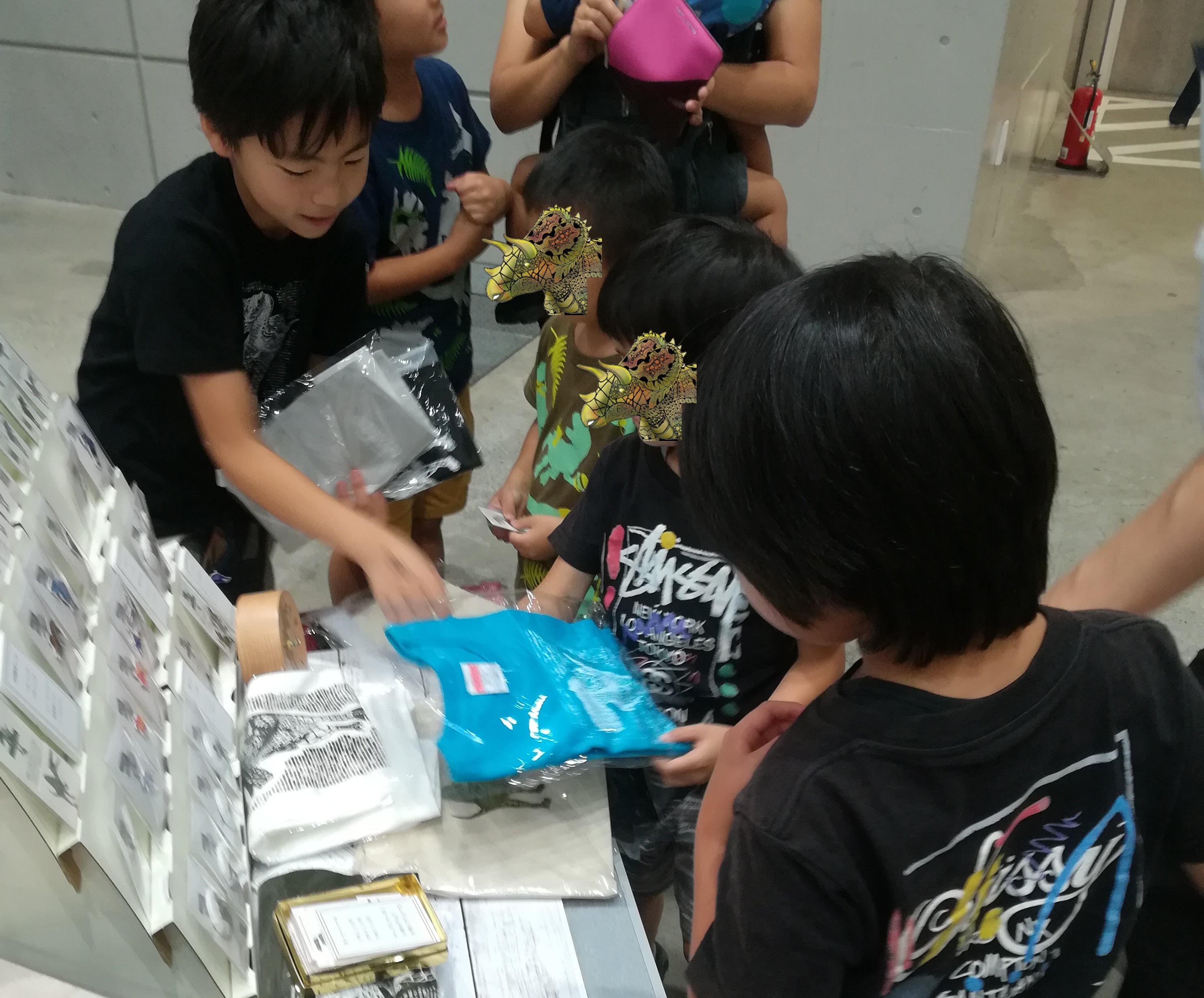 出来上がったイラストで恐竜グッズを作りました。シルクスクリーンの恐竜Tシャツ、サコッシュ、時計、缶バッジ、シール。グッズを作る過程でも、二人で力を合わせて作りました。