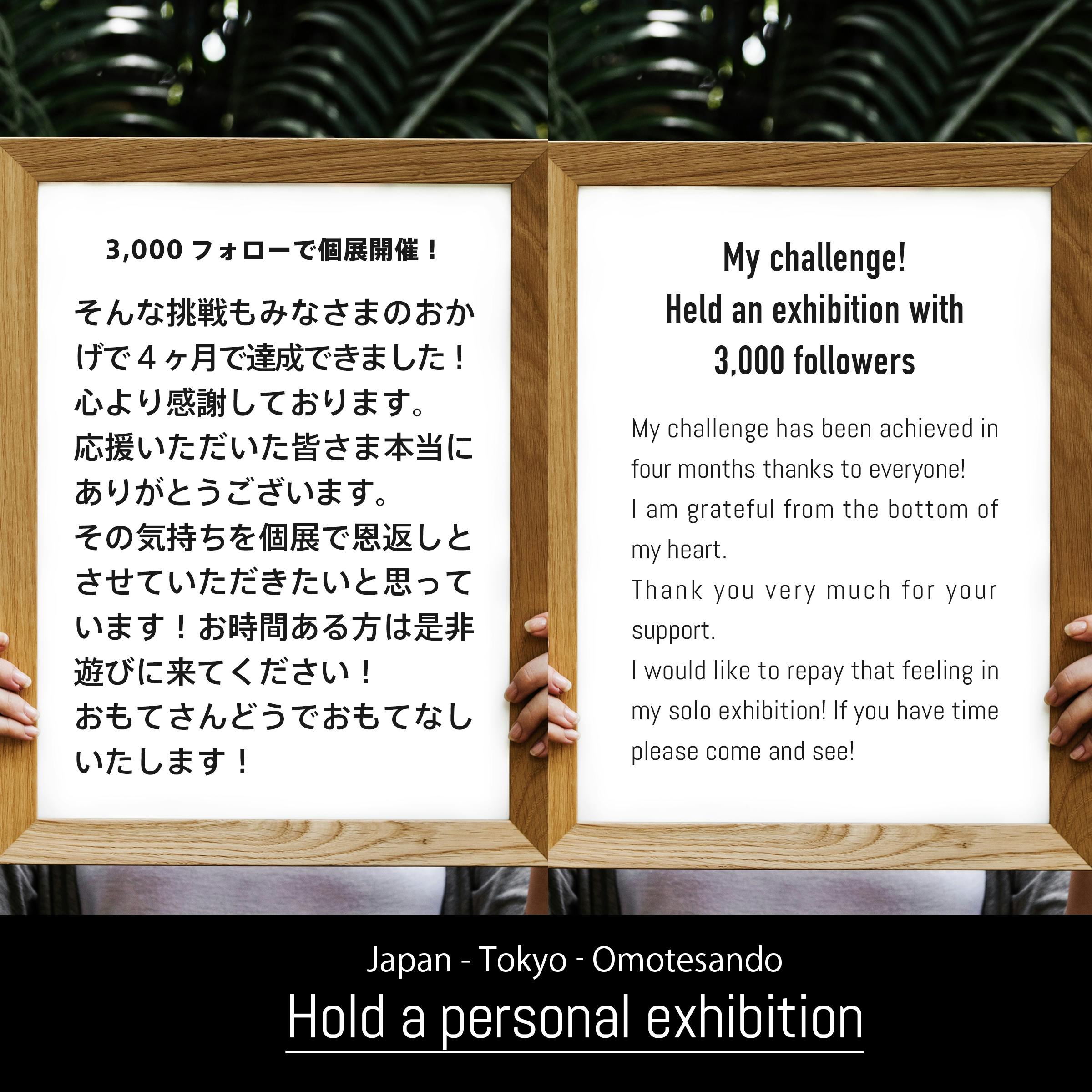 そして、おかげさまで このたび、「4ヶ月で3000人フォロワー達成」という、ひとつの挑戦がクリアできました!ありがたい事に『有言実行』を掲げることで 個展を応援してくれる方々とも出会うことができたのです。