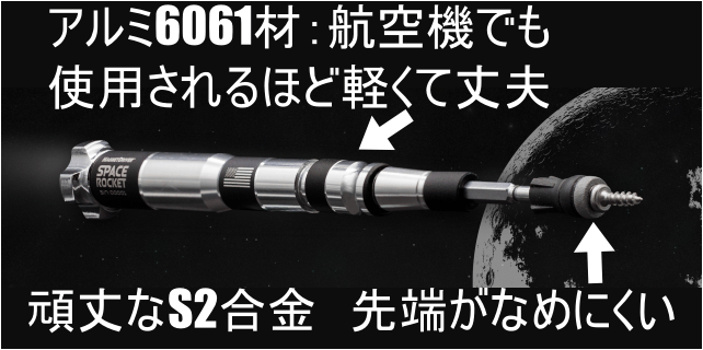 ・硬度の高いS2合金鋼のドリルビットと航空機などでも使われる軽くて丈夫なアルミ6061を使用しているため頑丈で長持ち