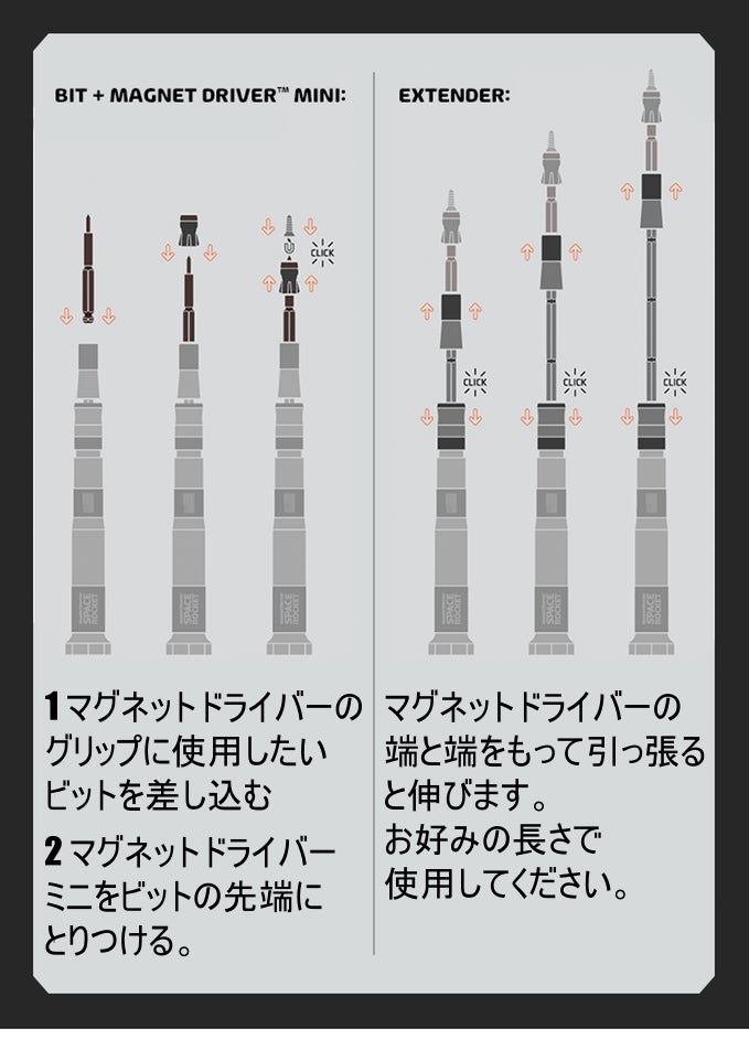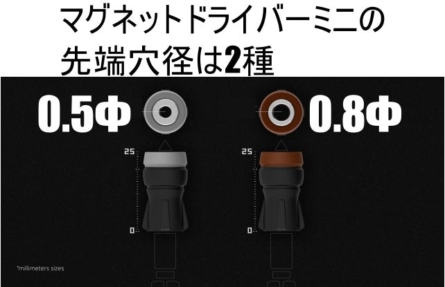 〇マグネットドライバーminiは色違いで2種の先端の径を用意。最大で20種類のビットで様々なシーンに対応が可能
