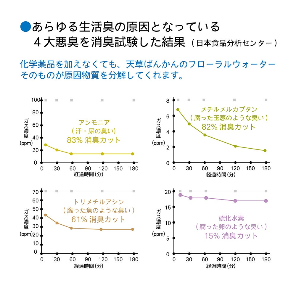 天草ばんかんのフローラルウォーターを消臭試験すると生活臭の原因となる4大悪臭に効果があることが分かりました。