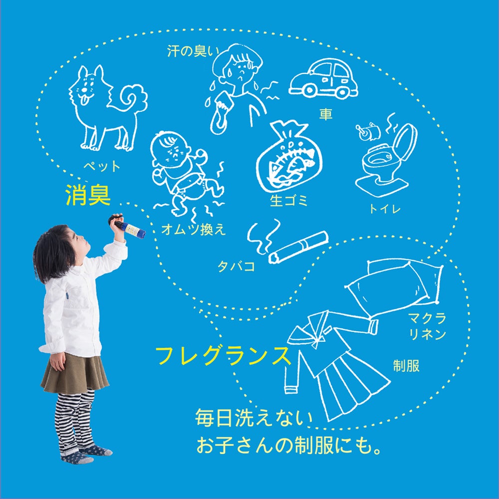 なかなか洗えない子どもの制服や帽子、赤ちゃんのおむつ替えのあと、ワンちゃんのトイレあとなど生活の様々なシーンでお使いいただけます。