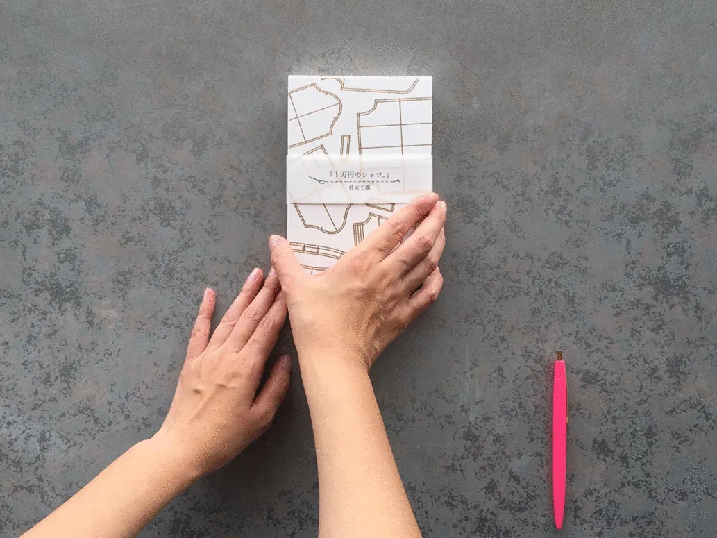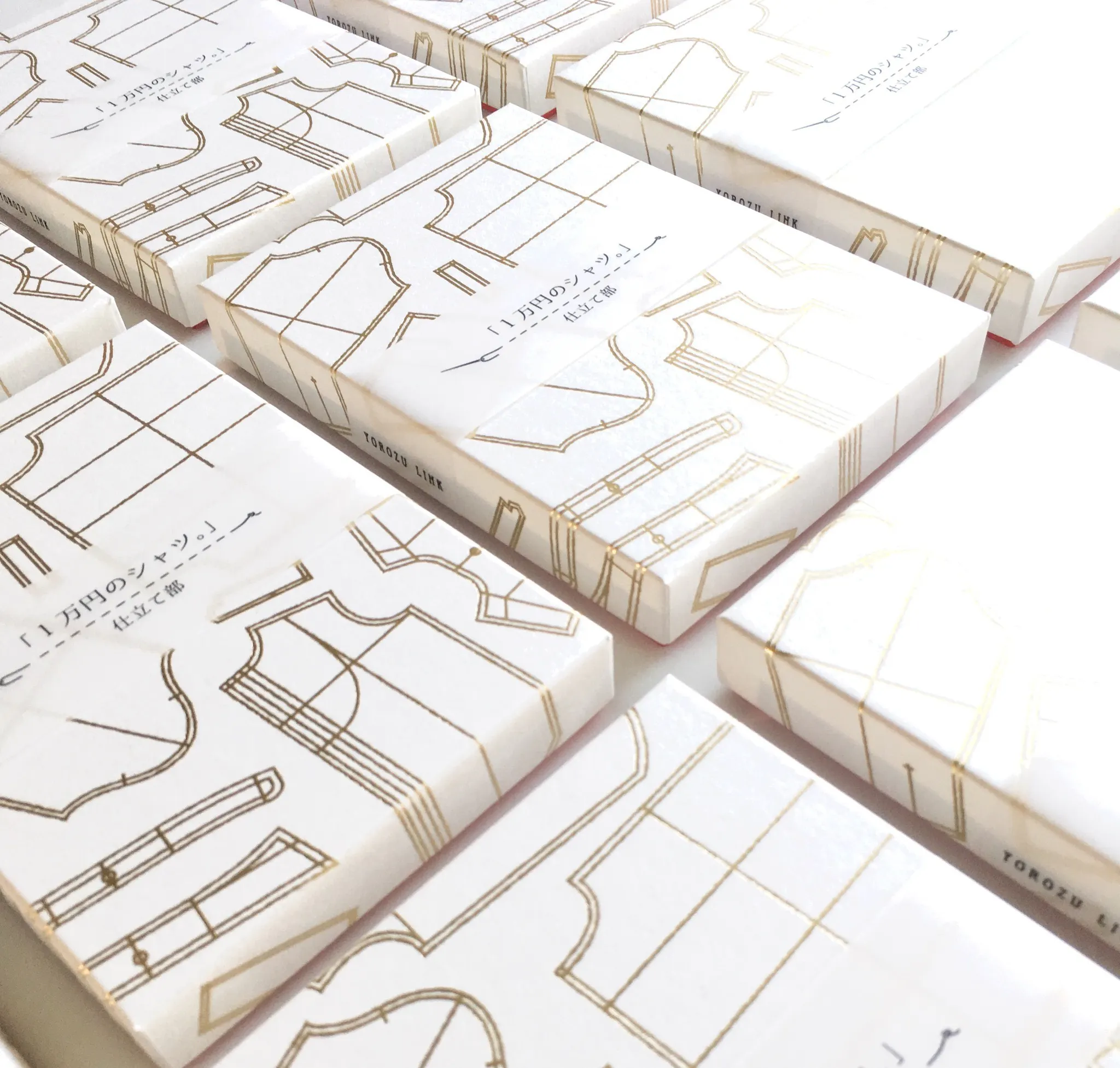 白と赤を基調にして、蓋にはゴールドの箔押しでシャツのパターン(型紙)が