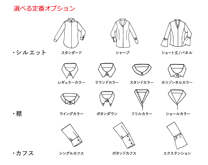 生地、スタイル、襟、カフスをお選び頂きます。