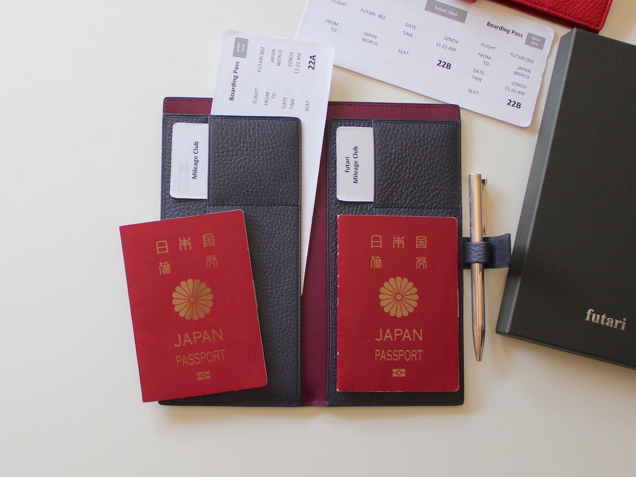 futari passportは、二人分のパスポート・搭乗券・カード類などあらゆる渡航書類一式をひとつにまとめて収納できます。