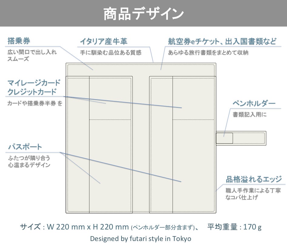 このたび提案する二人用パスポートホルダー「futari passport」(読み方:フタリパスポート)は、単なるパスポートの入れ物ではなく、パートナーと一緒に人生の旅を歩もうという、心に訴えかけるメッセージが込められたアイテムです。愛する伴侶と歩む生涯は、長いようでとても短く、その一瞬一瞬を幸せに大切に過ごしたいもの。そんなふたりに素敵な体験と思い出を、という想いから生まれたfutari passport。