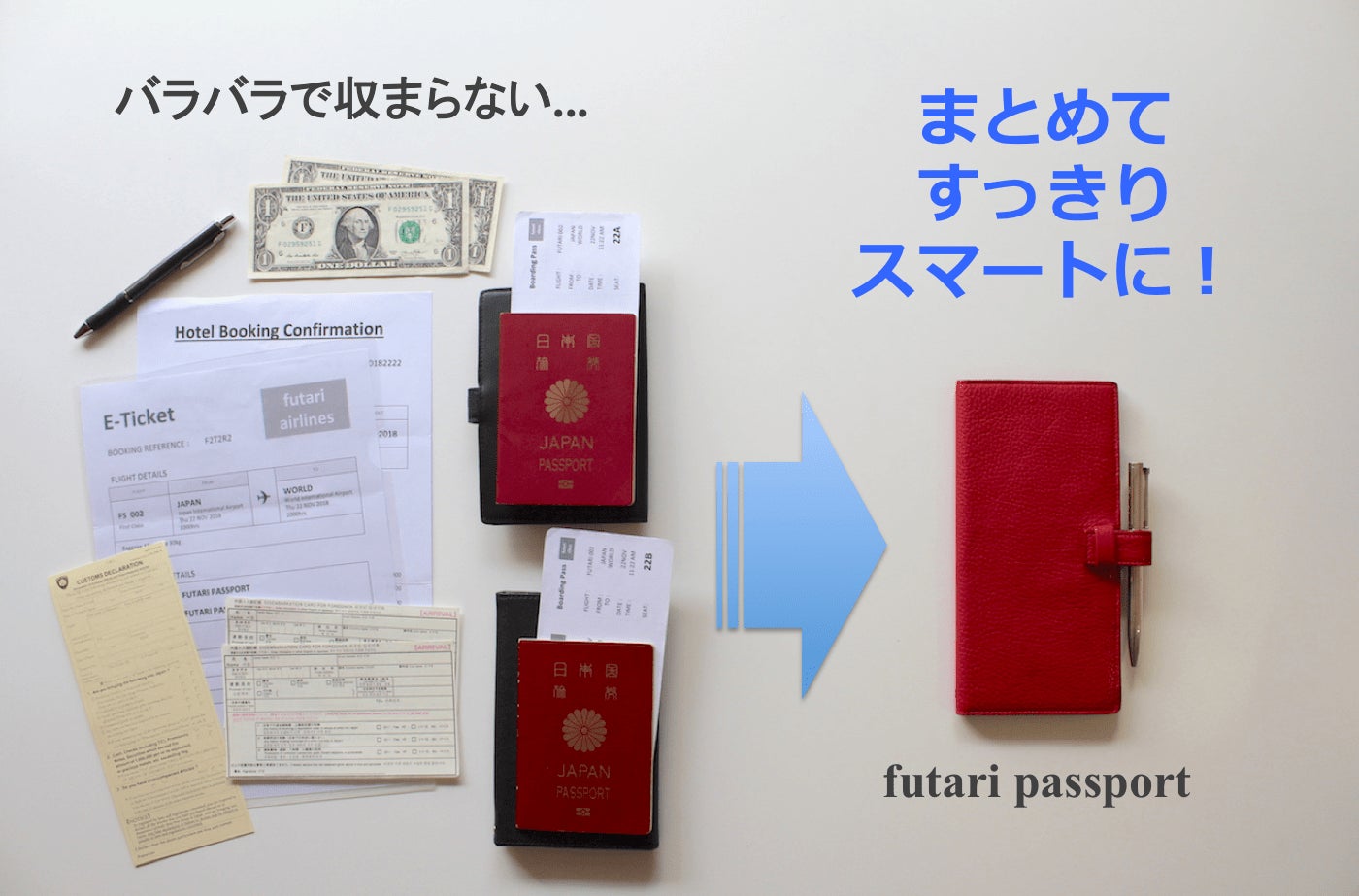 従来パスポートは各自別々に保持していましたが、旅行の際、航空券予約・搭乗手続き・出入国審査・滞在先チェックインといつもふたりがパスポートを出す場面は一緒であり、その度に各自が出し入れするという面倒なものでした。