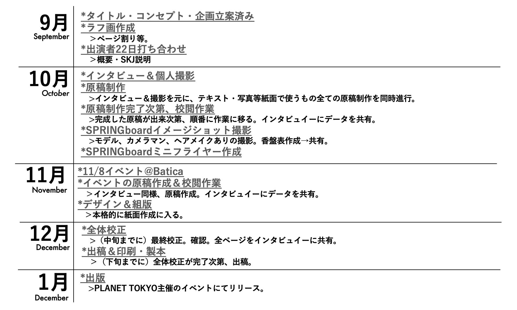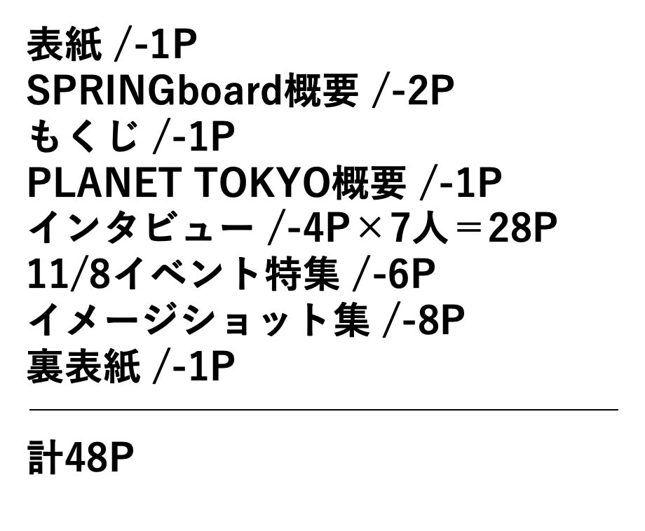vol.1はSPRINGboardが注目する、現在様々なシーンで活躍している平均年齢20歳の若手アーティスト7人の集まり「PLANET TOKYO」のインタビューと、初となるPLANET TOKYO主催のイベントの密着を中心とした内容です。