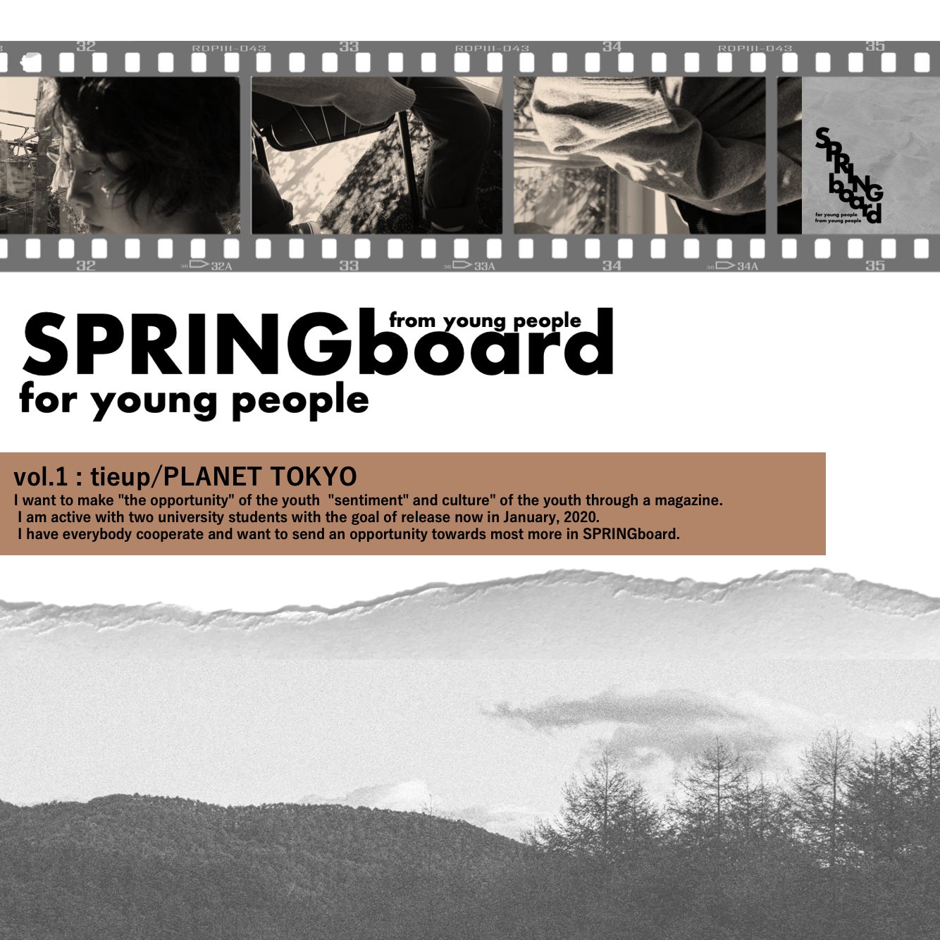 この雑誌名のspringboardには2つの意味があります。1つ目は“跳び箱で使う踏切板・跳躍台”、2つ目は“きっかけ”です。「若者から発信されたモノが若者のための踏切板・きっかけになるように」この願いを込めて、踏切台・きっかけの役割になる雑誌を作るプロジェクトです。
