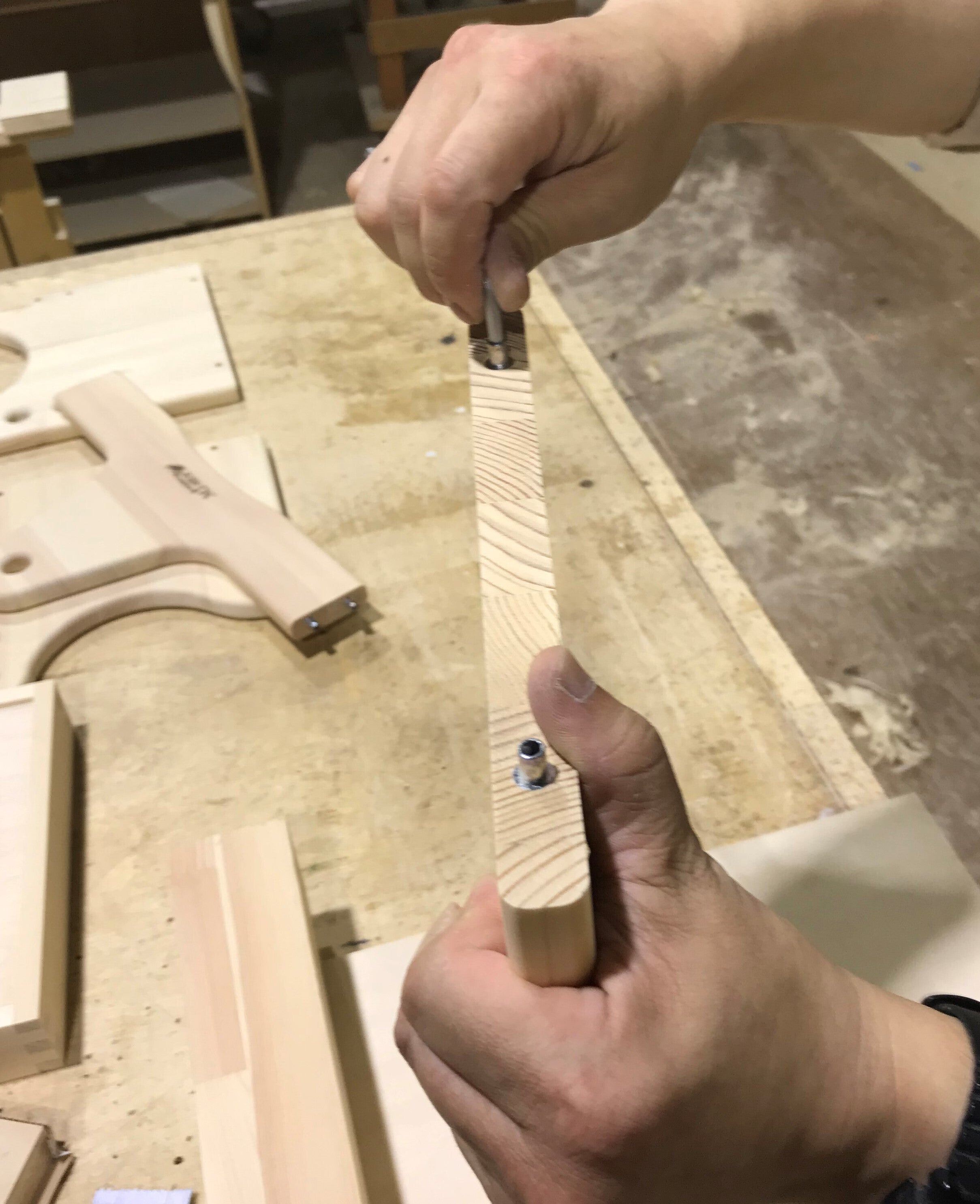4つの木のパーツをそれぞれの穴にはめ込み、8個のネジをドライバーなどで回して止めます。あとは、布を取り付けるだけ。ひもや布で結ぶ位置を変えると、高さや角度を自由に変えられ、どなたにでもジャストフィットします。