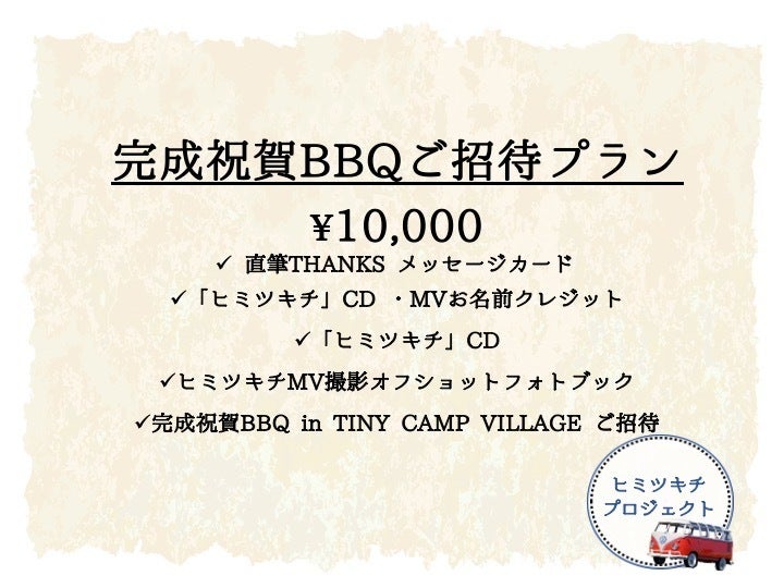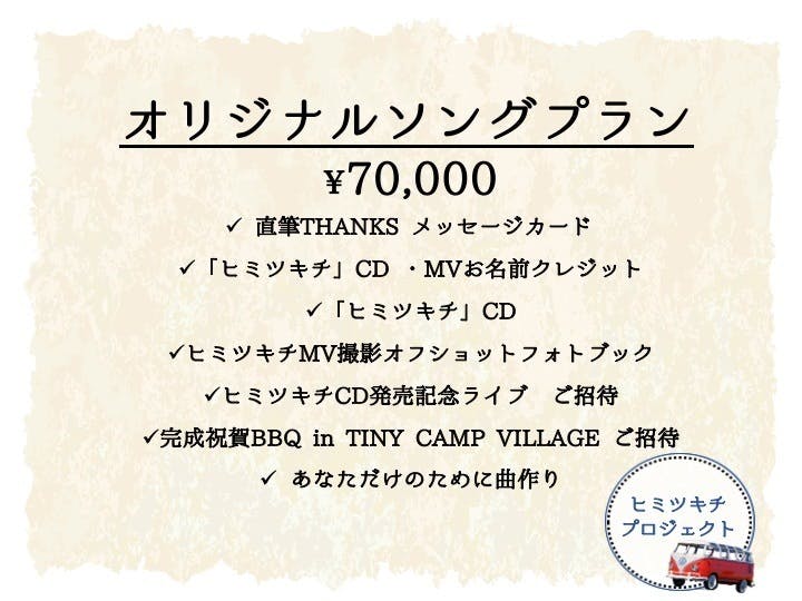 今回のヒミツキチプロジェクトを通して、「ヒミツキチ」楽曲をたくさんの方に聞いていただきたい、見て頂きたいのはもちろんですがそれ以上に楽しいものワクワクする事を皆様と一緒に実現させたいです。そしてヒミツキチプロジェクトを大きなものに膨らませ、夢のメジャーデビュー、そしてキャンプ音楽フェスの主催出演へ1歩近づきたいです。