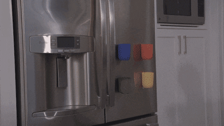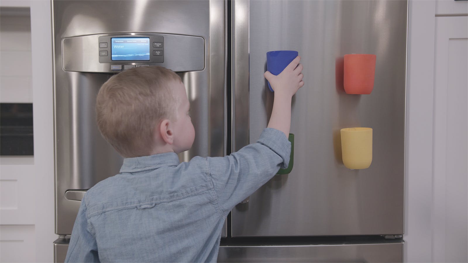 冷蔵庫の扉に貼ってあるマグネット付きコップは小さな子どもでも楽々届く高さにあるので、さっと取り外して水を飲んだら、またもとの位置に簡単に戻せます。