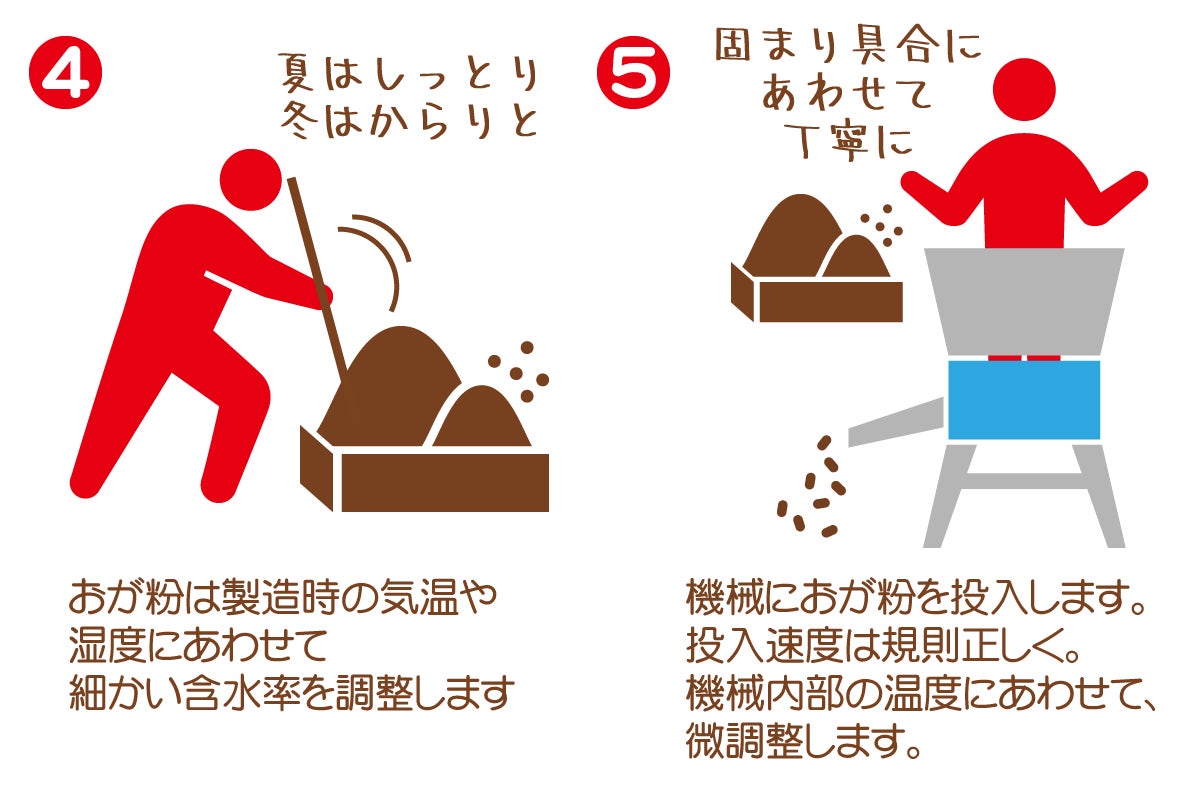 命の猫砂は「太陽と、風で作る猫砂」というネーミングが表わす通り、製造工程は農業のように自然と向き合う作業であり、人手により丁寧に、猫砂一粒一粒を手間をかけて作ります。