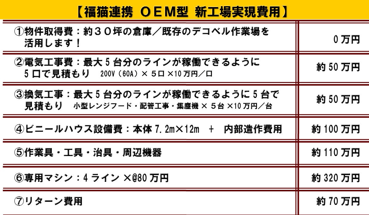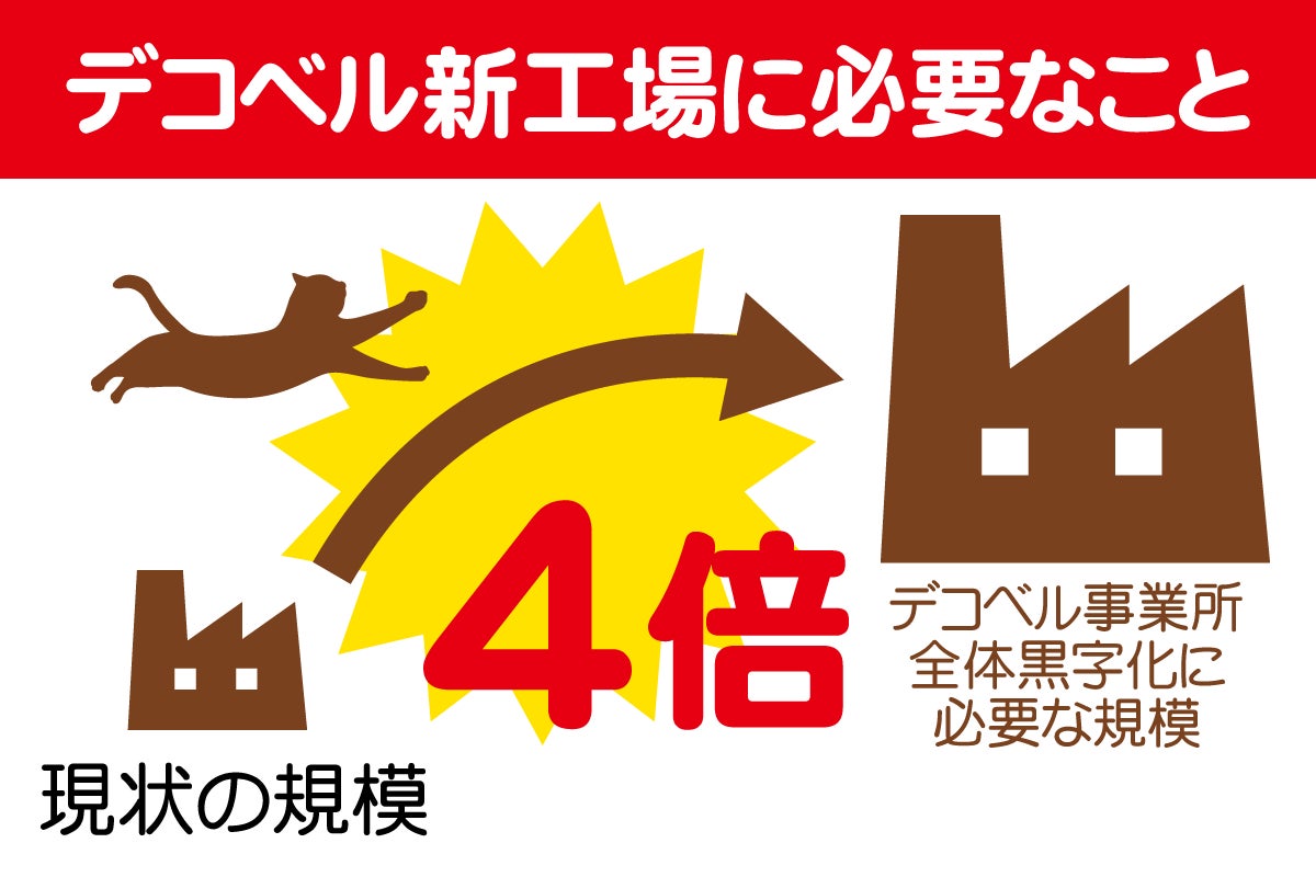 しかし、福猫連携の仕事量を4倍にするためには、現状の工場内の製造設備では足りず、新たな工場が必要になります。
