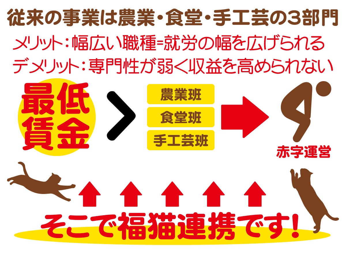 こうして「福猫連携プロジェクト」を進める中で、私たちは昨今のA型事業をとりまく、厳しい現実と正面から向き合いました。