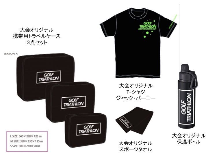 大会専用グッズの保温ボトル(黒)、大会オリジナルT−シャツ(ジャック・バーニー)大会オリジナルタオル(94cmx33cm)の3点セットです。T−シャツは黒に白抜きの文字を予定していますが若干のデザイン変更があります。分かり次第ご案内します。サイズはメンズ用(フリーサイズ:Lサイズに相当)、レディス用(フリーサイズ:Lサイズに相当)