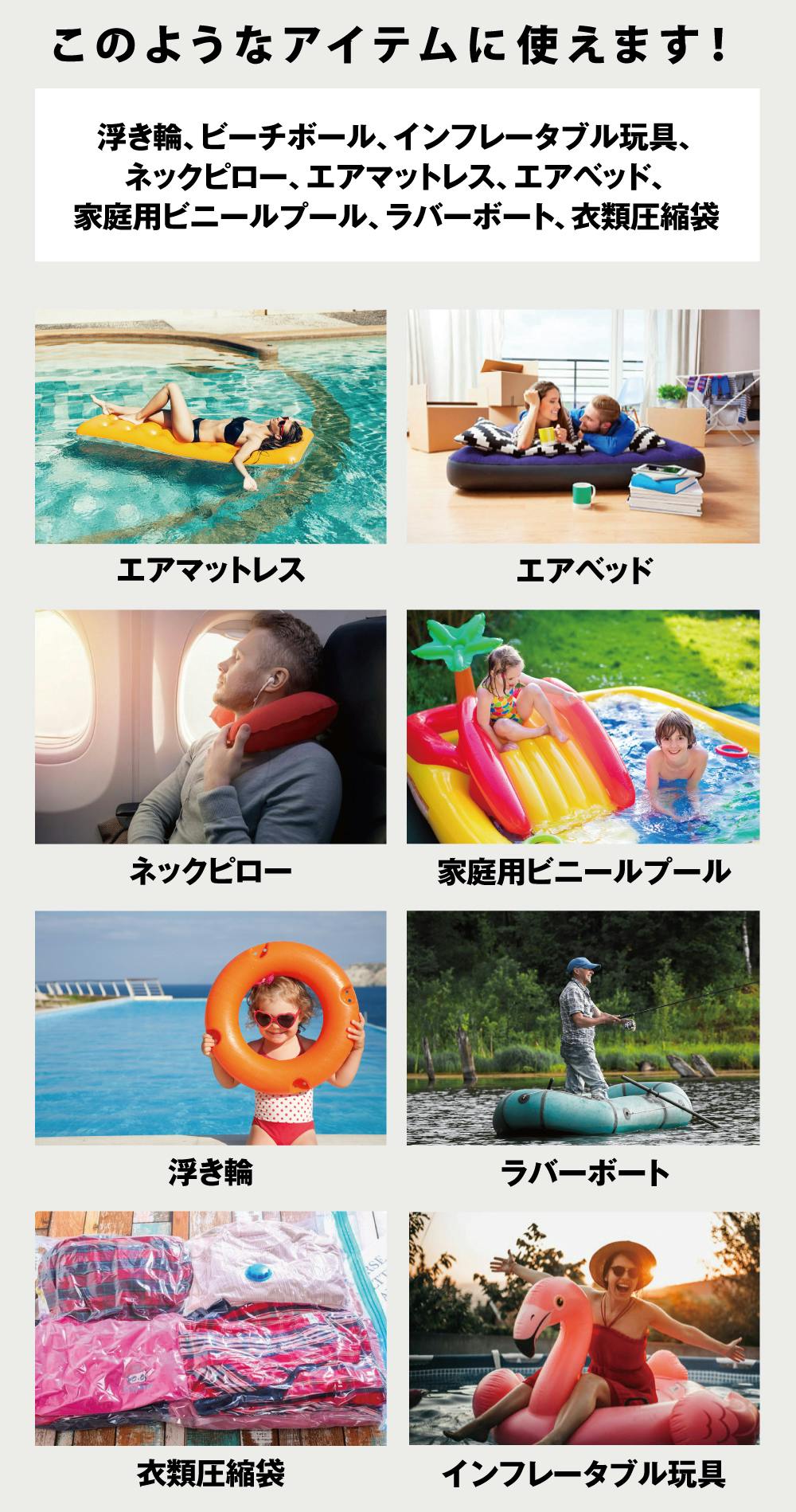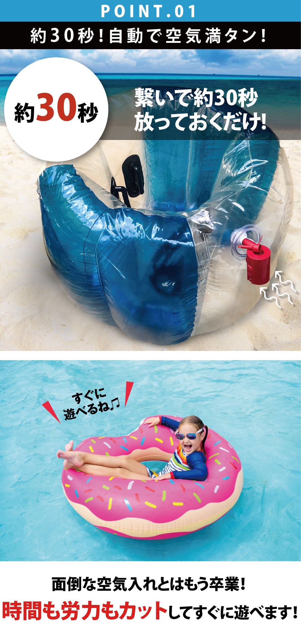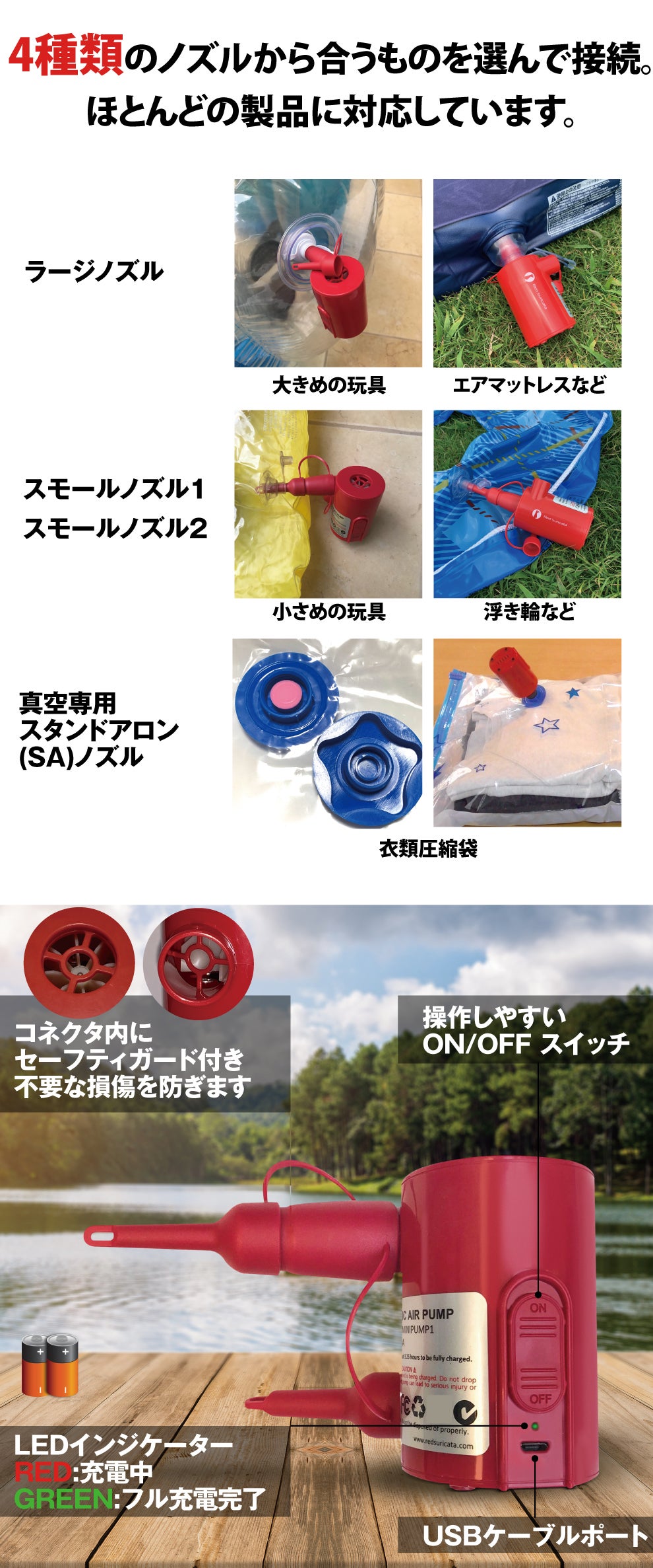 - ①自動で空気入れと空気抜きができる1台2役のミニエアーポンプ!無駄な時間と労力カットで開放感!