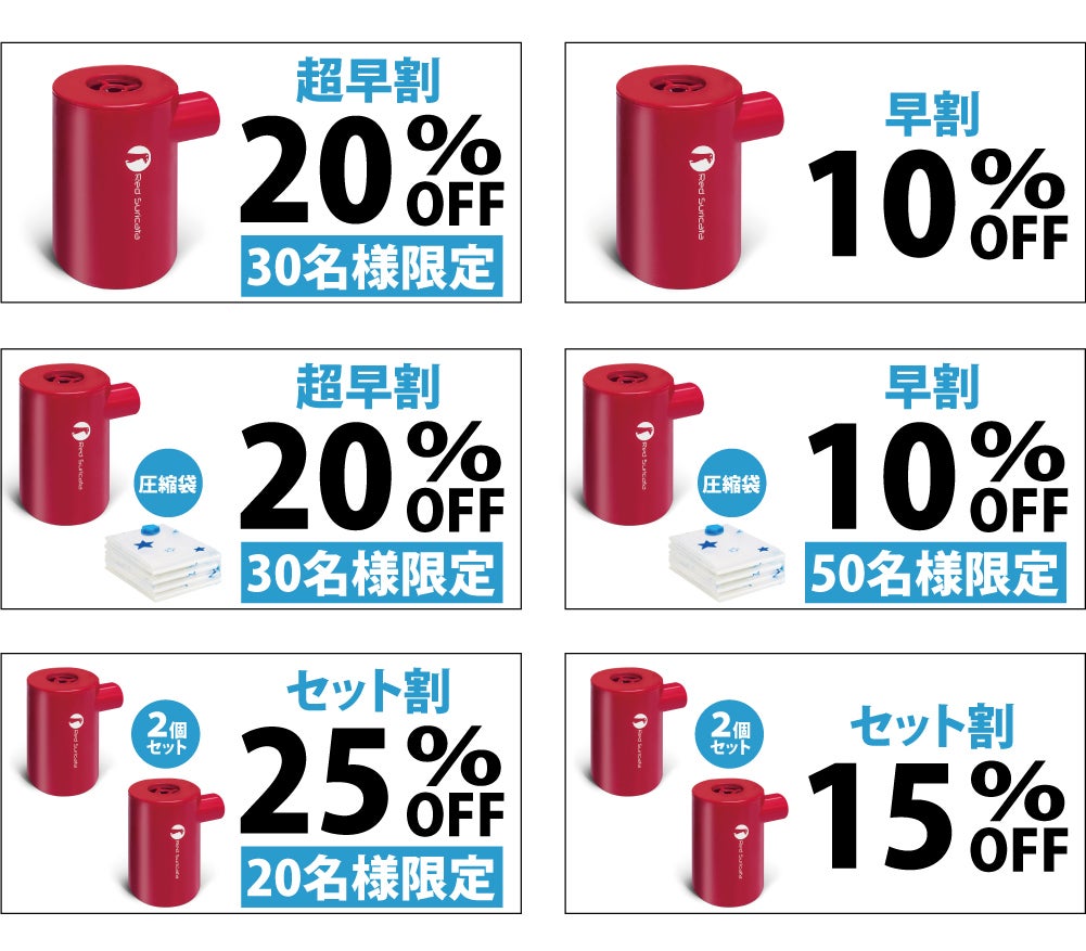 2019/10/16 11:12この度はキャンプファイヤープロジェクトにご支援いただきまして、ありがとうございます。ご支援いただいた皆様に配送状況をお知らせします。昨日、メーカーからプロダクトが日本に到着しました。本日より発送準備に入り、準備ができ次第、順次発送いたします。ようやく皆様の元へ「RED SURICATA MINI AIR PUMP」をお届けできることを大変嬉しく思います。プロダクト到着後、内容をご確認ください。万が一付属品が足りない、初期不良などがあった場合は日本語説明書に記載のアフターサービスをご登録の上ご連絡ください。どうぞよろしくお願いいたします。 もっと見るお届け予定が早まりました!