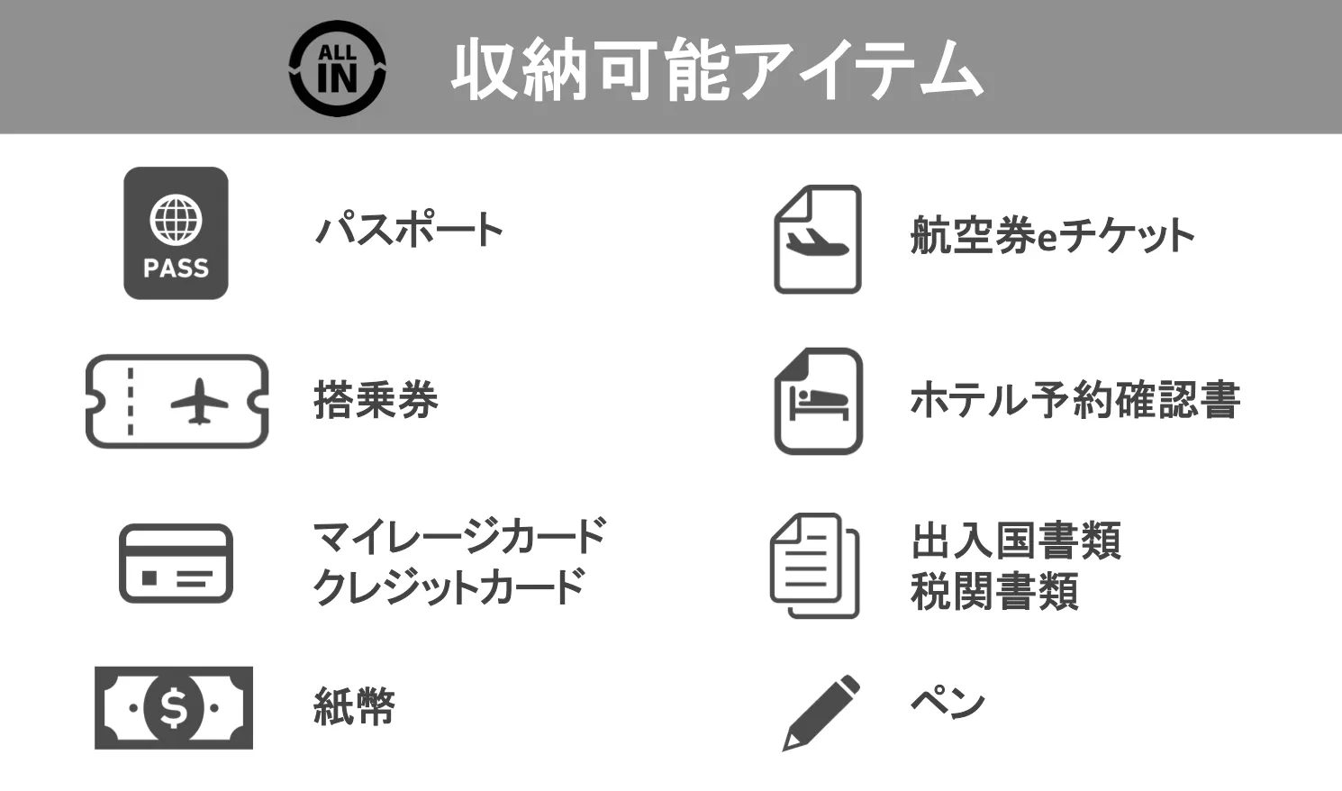 一目で貴重品が揃っているかを確認可能。
