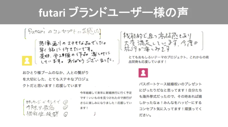 これまでにfutari ブランド商品ユーザー様からいただいたお便りやメッセージです。改良案などアドバイスをいただくこともあり、商品開発に取り入れさせていただいております。