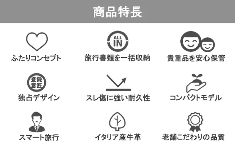 ふたりのパスポートを正面に並べて収めることができるデザインは、人と人とのつながりを感じさせ、ささやかな幸せをもたらしてくれます。開発した独自構造(意匠登録済)により、当社だけのオリジナル商品です。