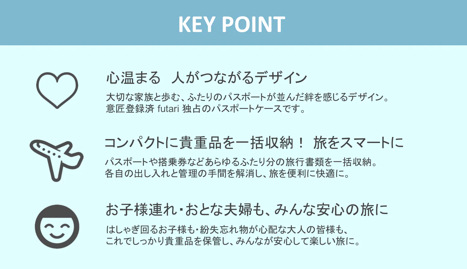 従来パスポートは各自別々に保持していましたが、旅行の際、航空券予約・搭乗手続き・出入国審査・滞在先チェックインといつも同伴者とパスポートを出す場面は決まっており、その度に各自が出し入れするという面倒なものでした。