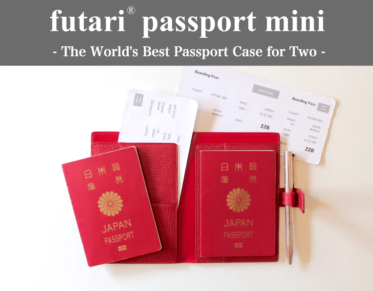 futari passport miniは、二人分のパスポート・搭乗券・カード類などあらゆる渡航書類一式をコンパクトにひとつにまとめて収納できます。
