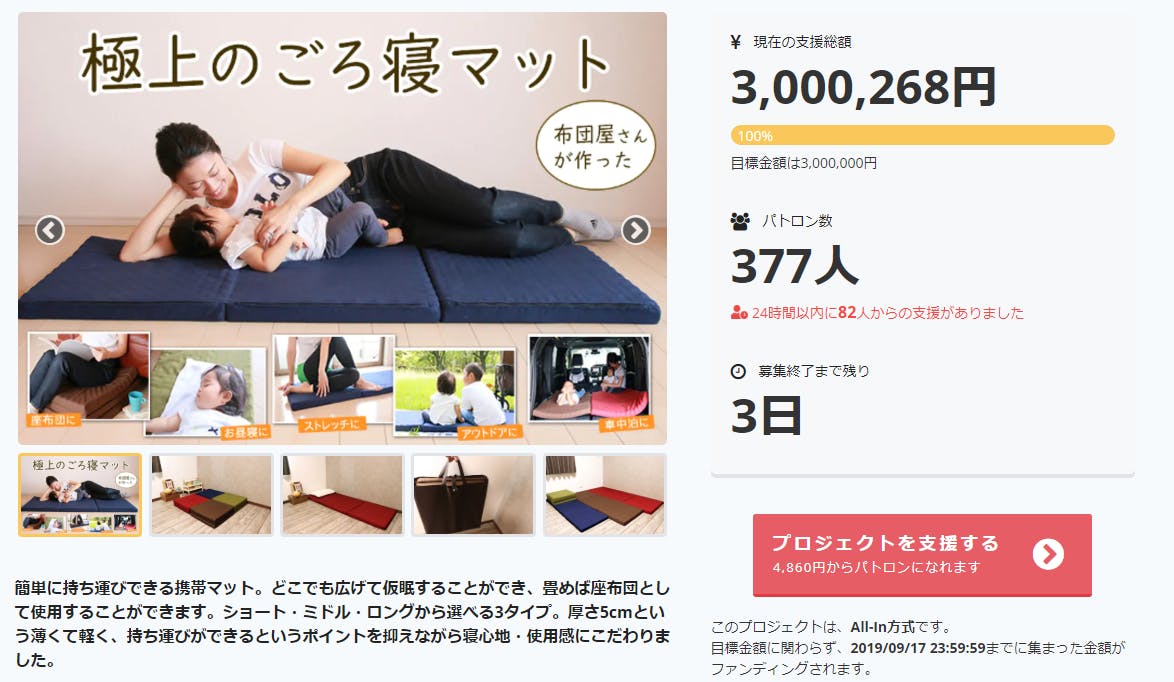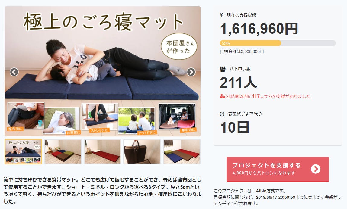 150万超えて50%達成しました!「3秒で寝れる!携帯マットTOKURI」