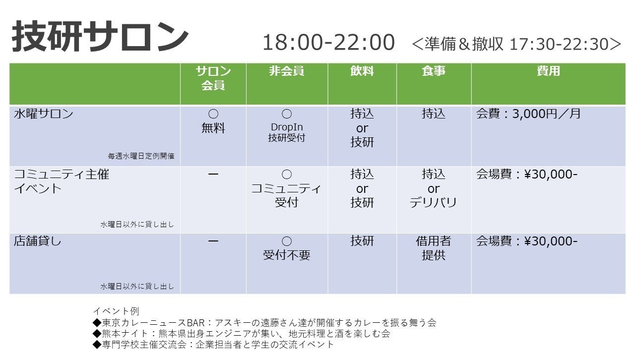 •技研サロン水曜年会費+サロン貸切1回分:5万円 水曜以外の平日夜で1回技研を貸し切り可能