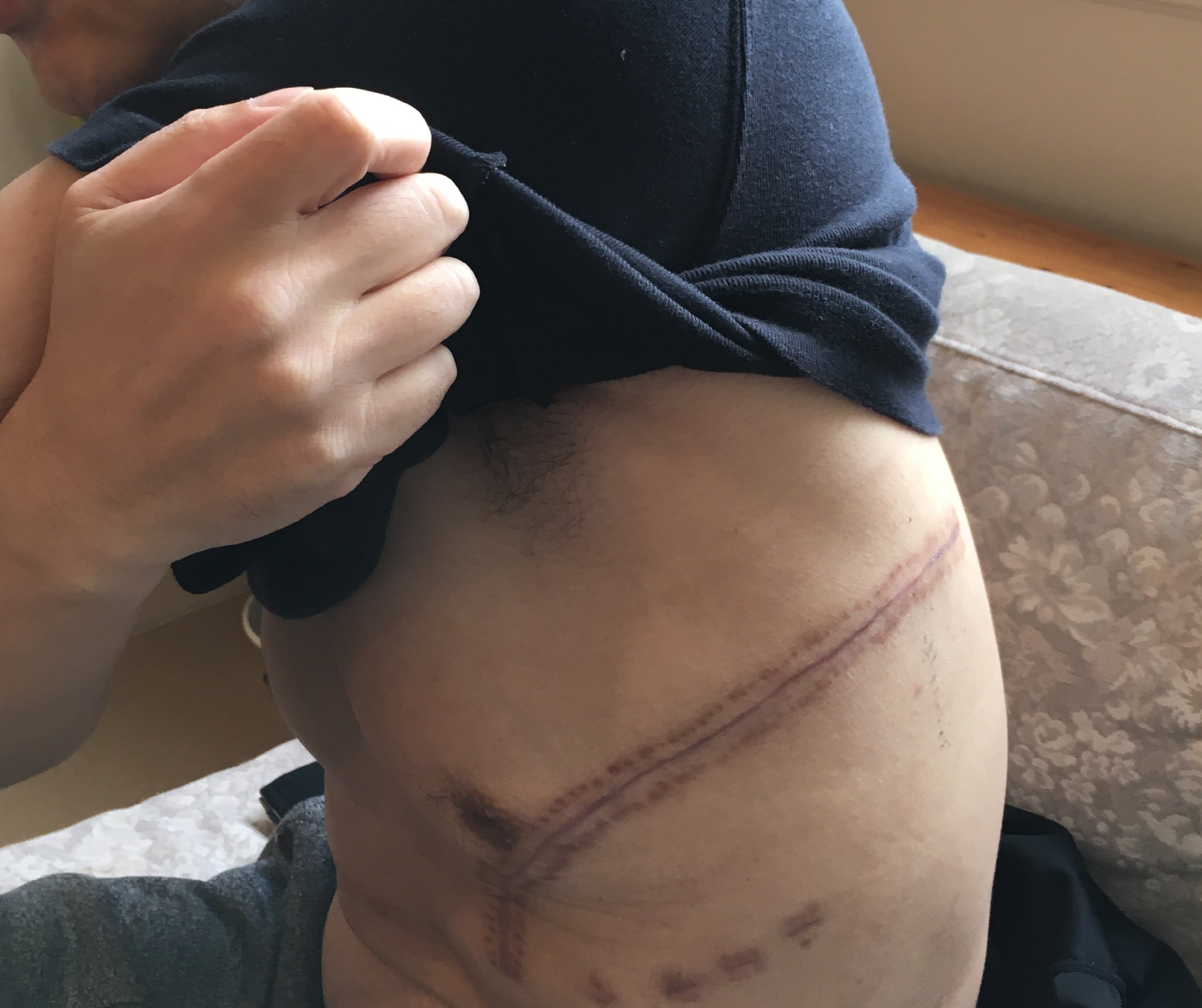 手術による胸部切開痕は、24時間絶えず痛みが消えることはなく、時折り激痛で立っていられないほど呼吸が苦しくなることもあります。