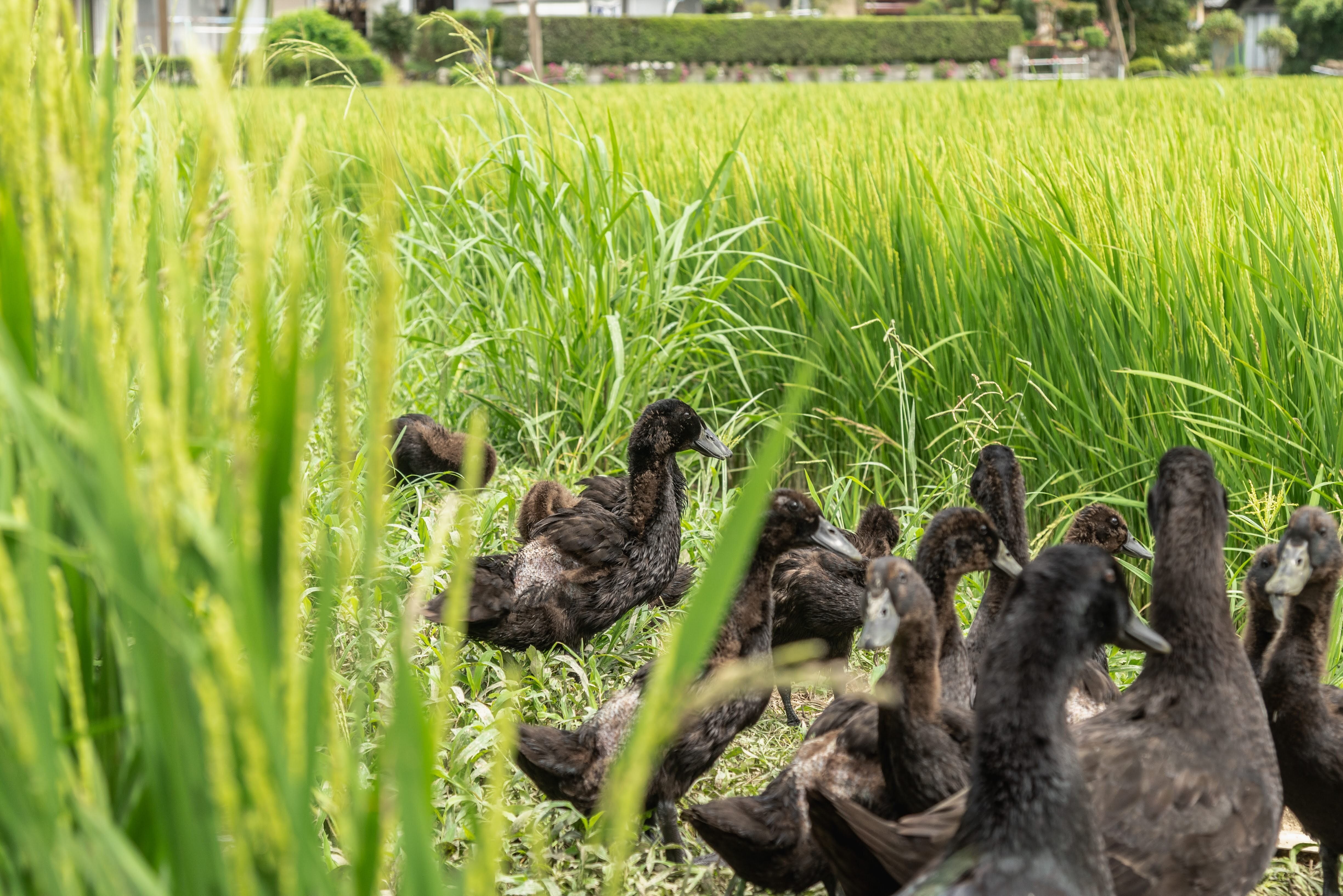雑食性のアイガモは、水田内のウンカ類など害虫を好んで食べるため害虫防除効果がありますし、泳ぎながら水田を掻き回し、水田内に酸素を補給するとともに、常に水を濁らして水温を上げ稲の成長を助けます。稲についている虫を食べたり、アイガモが動くことによって与えられる接触刺激が稲に作用し茎太で、株張のよいしっかりとした稲を作るとも言われています。