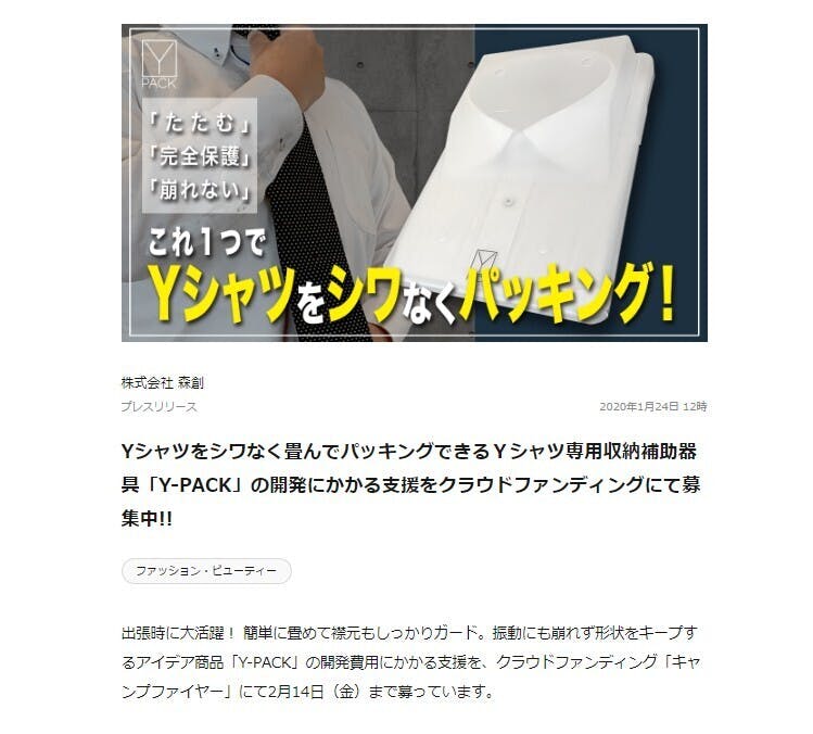 2020/01/24 14:51皆様こんにちは!支援有難うございます。少しずつではありますがサクセスへ近づいております。ですがこの商品を皆様にお届けするには支援がまだまだ必要となります。本日よりバリュープレス様(PRサイト)より『Y-PACK』の記事を配信しておりますのでよろしければそちらのチェックも宜しくお願い致します。残り22日!!!商品化に向けてどんどんPR活動していきますので応援して下さる方は是非とも友人やSNS等に拡散して広めて頂ければ幸いです。 もっと見る