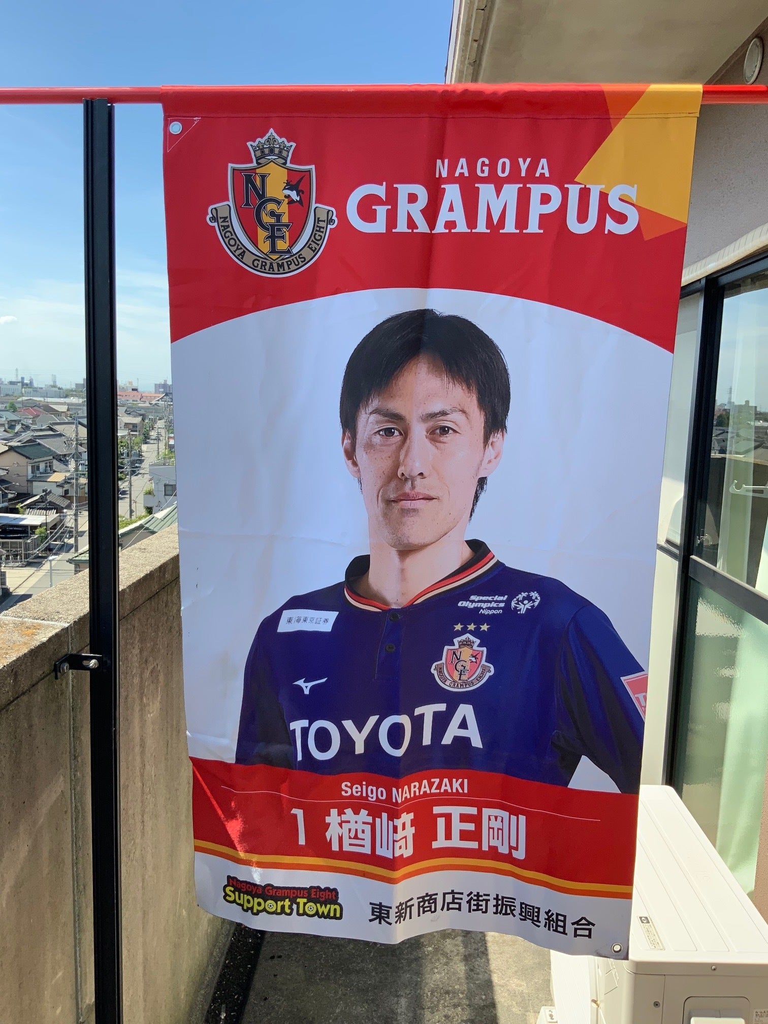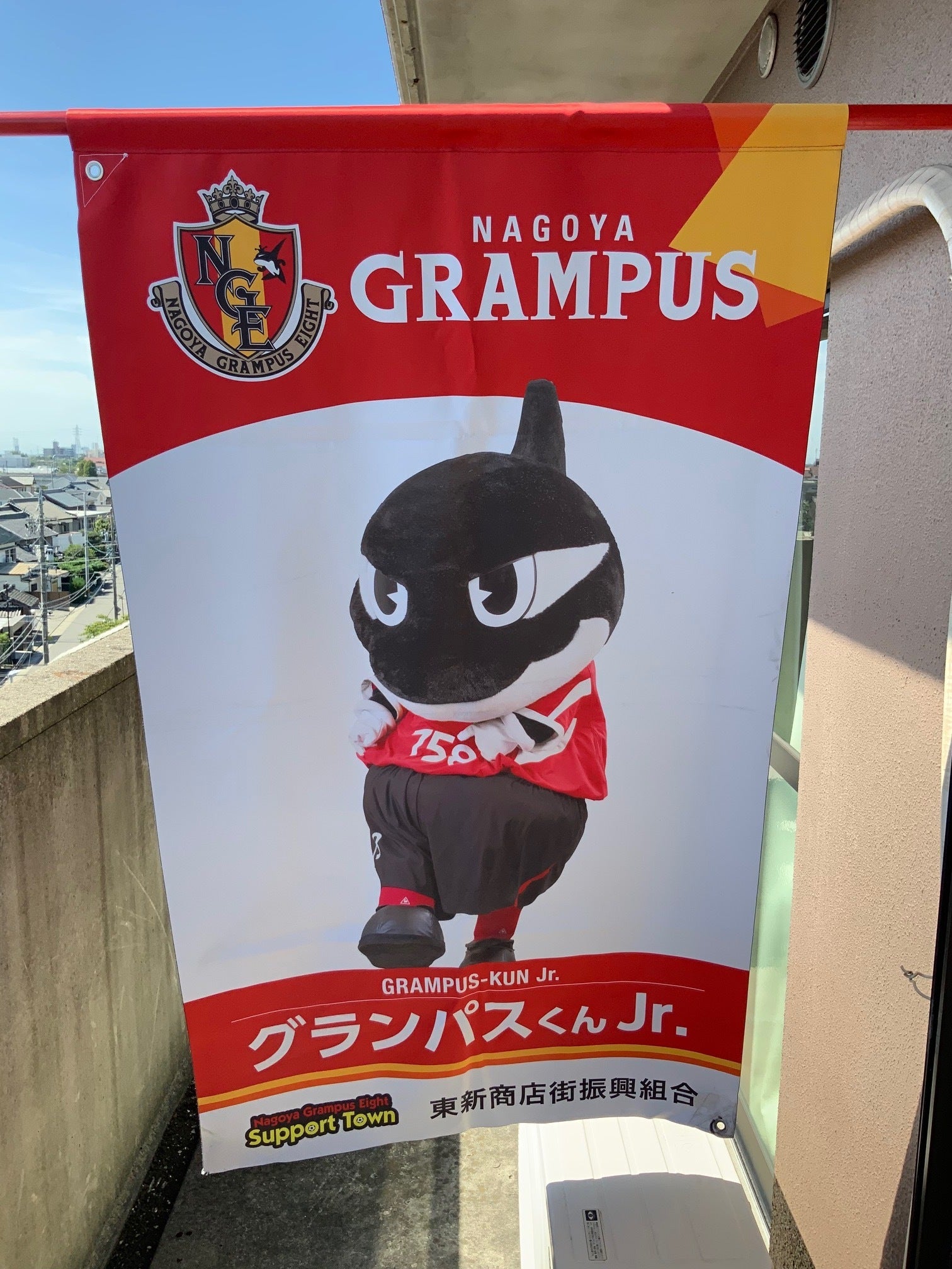 現役最後のフラッグで、他にございません。東新商店街に掲示されているフラッグはグランパスサポートタウンのフラッグの中でも最も大きいものになります。