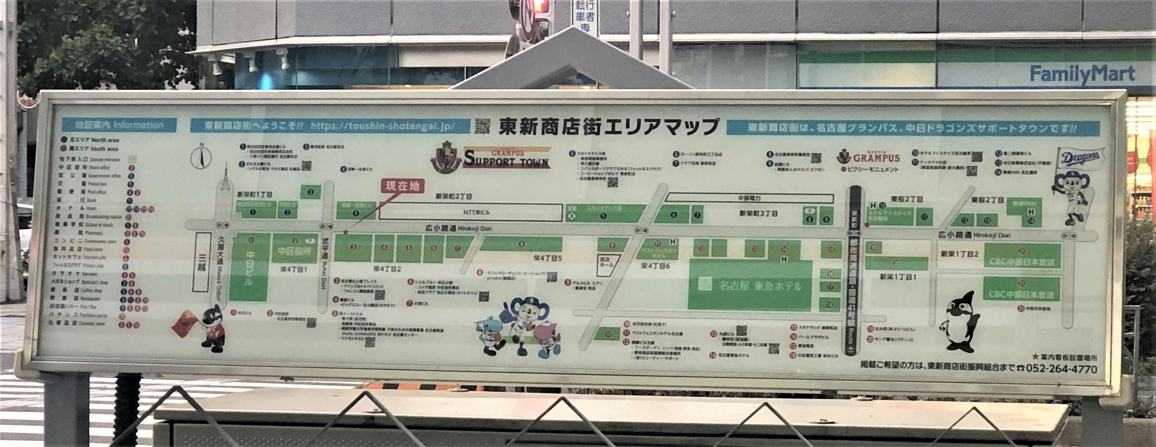 東新商店街は名古屋の中心地である地下鉄栄駅の12番出口を出てすぐの広小路通りにあり、西は中日ビル前から、東はCBCまでの東西500メートルに伸びる商店街です。