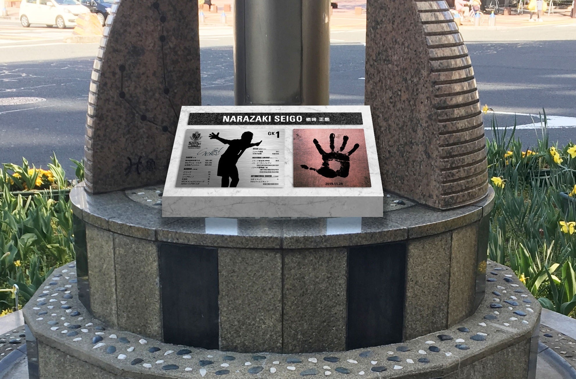 モニュメントは、名古屋グランパス・楢崎正剛CSFのご協力をいただき取らせていただいた手型を埋め込み、除幕式そしてその後に記念イベントを開催させていただきます。