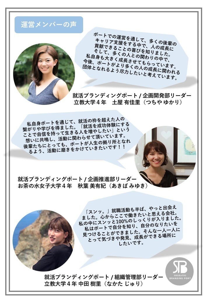 就活ブランディングポートの運営メンバーは現役の大学生(内定者)で構成されています。メンバー全員が就活ブランディングポートの卒業生で、後輩の“未来”のために大学最期の貴重な1年間をボランティアで協力してくれています。