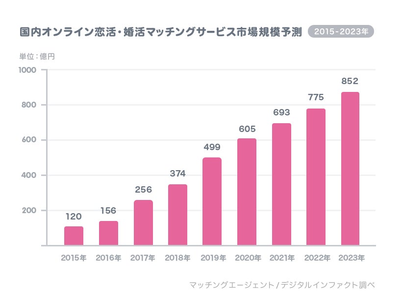 結婚相談所に登録する人数は、年々大幅に増加し、マッチングサイトなどの市場も大きく伸びているのです。