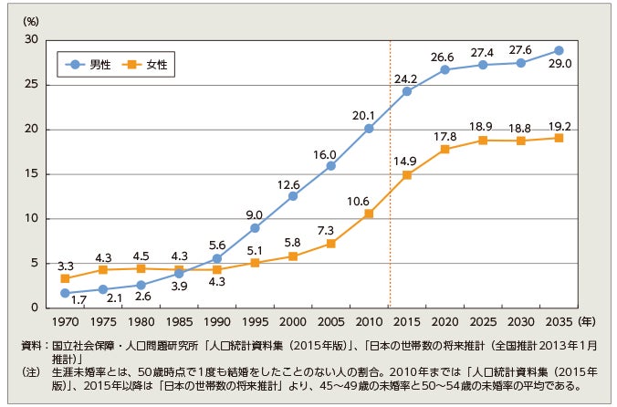 晩婚化…働く女性が増えたことに伴い、初婚年齢が高くなってきている。1980年代には24~25歳だった初婚年齢が、2016年には平均初婚年齢は、29.4歳で、年々高くなってきている。晩婚化に伴って晩産化も進み、出産適齢期の女性が減って出生率も低下するため、国も自治体も婚活を積極的に支援するようになってきた。しかし、もっと深刻なのは下記の問題です。