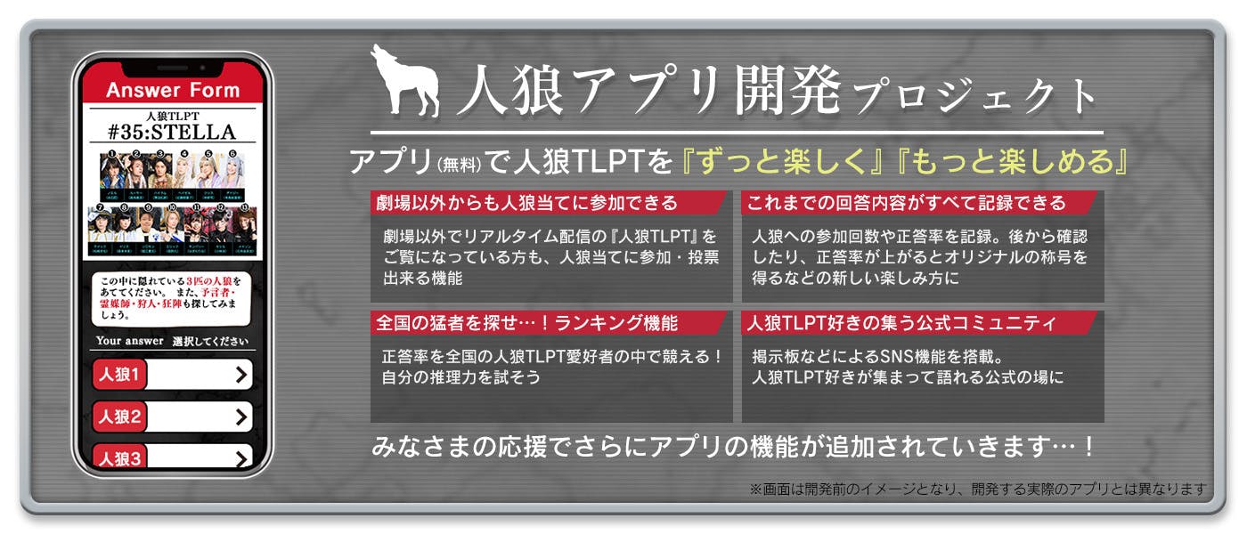 本プロジェクトでご支援を頂きました資金は、劇場にご来場いたただいた、お客様にお楽しみ頂くだけではなく、公演期間以外でも人狼TLPTに触れて頂けるような楽しいコンテンツを満載したスマホアプリの開発資金とさせて頂きます。目標額を上回るご支援を頂いた場合は、アプリのコンテンツ拡充のために使用させて頂きます