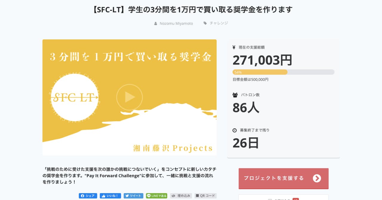 SFC-LTでは学生に3分間で自分の挑戦を発表してもらい、それに対して1万円を支援します。その発表の様子は動画に収めてSNSで拡散し、同時にその学生への追加の支援のクラウドファンディングを行います。そして、そのクラウドファンディングの手数料を用いて、次の学生の1万円を捻出していきます。